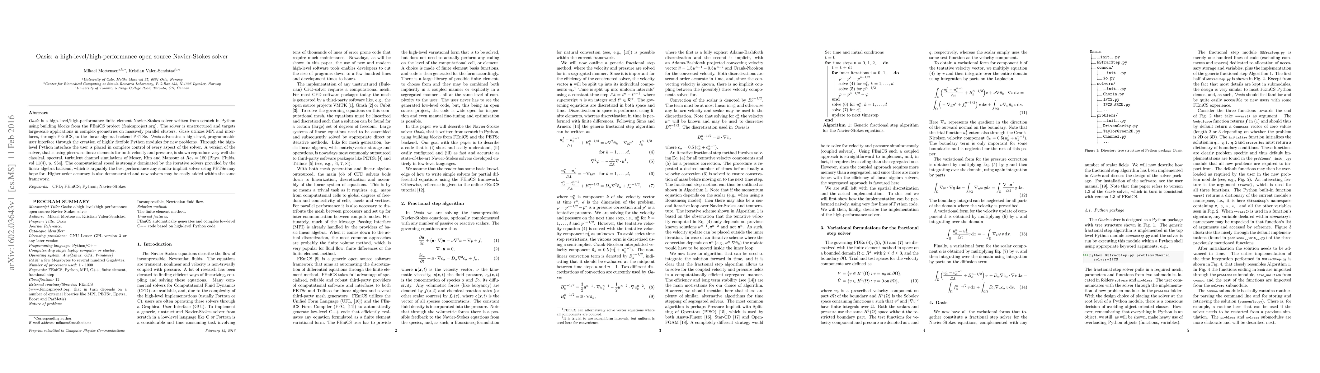 Oasis is a high-level/high-performance finite element Navier-Stokes solver written in Python using FEniCS project building blocks. It targets large-scale applications in complex geometries on massively parallel clusters, utilizing MPI and PETSc for linear algebra backend.