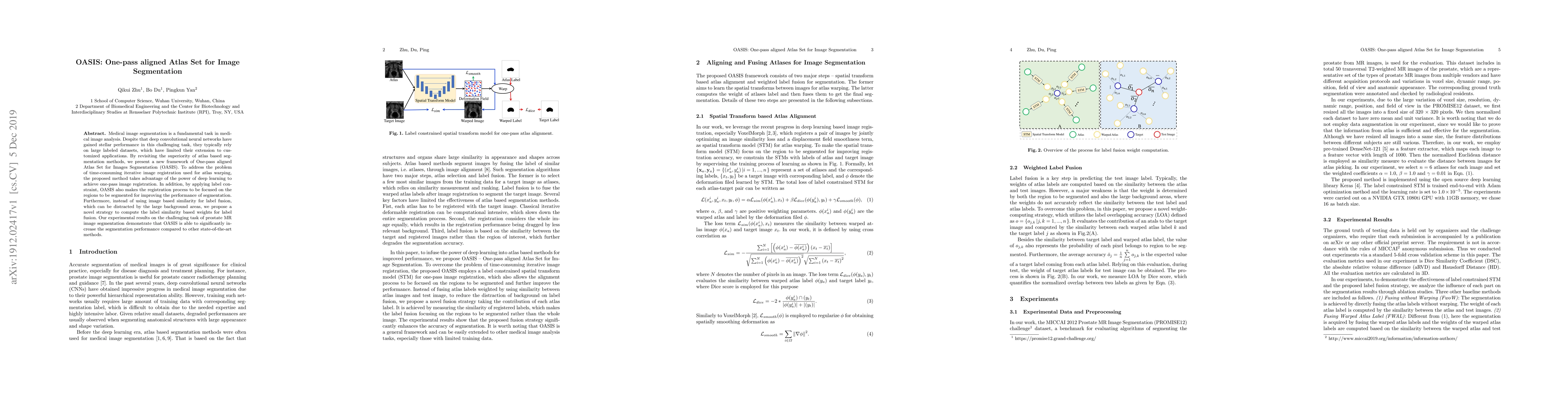 OASIS introduces a one-pass aligned atlas set framework for image segmentation, leveraging deep learning for efficient registration and label fusion, significantly improving prostate MR image segmentation performance over existing methods.