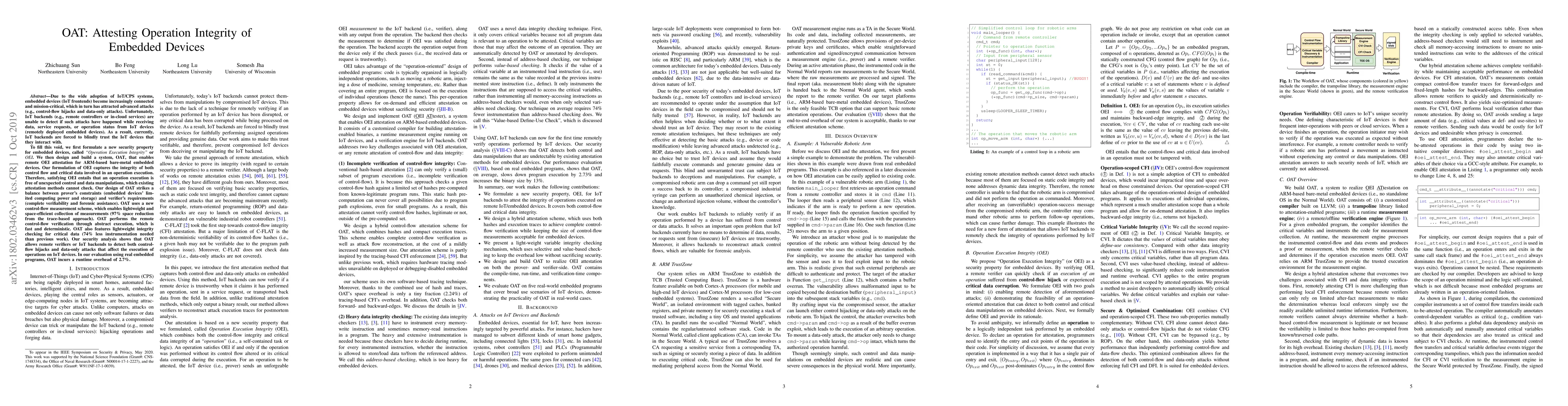 This paper introduces OAT, a system for remote attestation of "Operation Execution Integrity" (OEI) in embedded devices, addressing the lack of security detection in IoT backends. OAT employs a novel control-flow measurement scheme, abstract execution, and lightweight data integrity checks to verify the integrity of operation execution, achieving a 97% space reduction and 74% fewer instrumentations compared to prior methods, with a 2.7% runtime overhead.