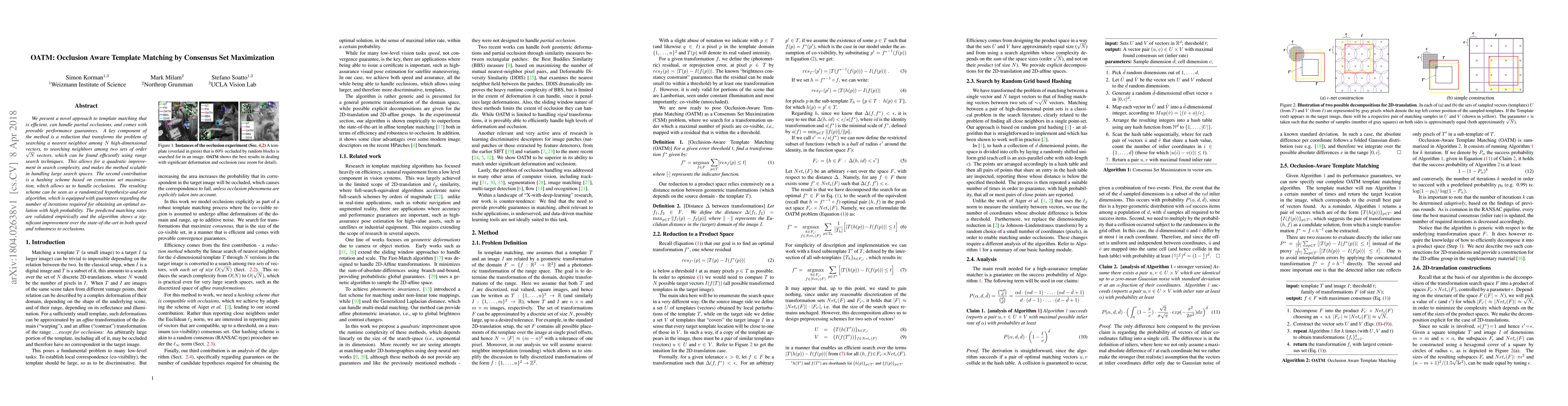 We present a novel approach to template matching that is efficient, can handle partial occlusions, and comes with provable performance guarantees. A key component of the method is a reduction that transforms the problem of searching a nearest neighbor among $N$ high-dimensional vectors, to searching neighbors among two sets of order $\sqrt{N}$ vectors, which can be found efficiently using range search techniques. This allows for a quadratic improvement in search complexity, and makes the method scalable in handling large search spaces. The second contribution is a hashing scheme based on consensus set maximization, which allows us to handle occlusions. The resulting scheme can be seen as a randomized hypothesize-and-test algorithm, which is equipped with guarantees regarding the number of iterations required for obtaining an optimal solution with high probability. The predicted matching rates are validated empirically and the algorithm shows a significant improvement over the state-of-the-art in both speed and robustness to occlusions.