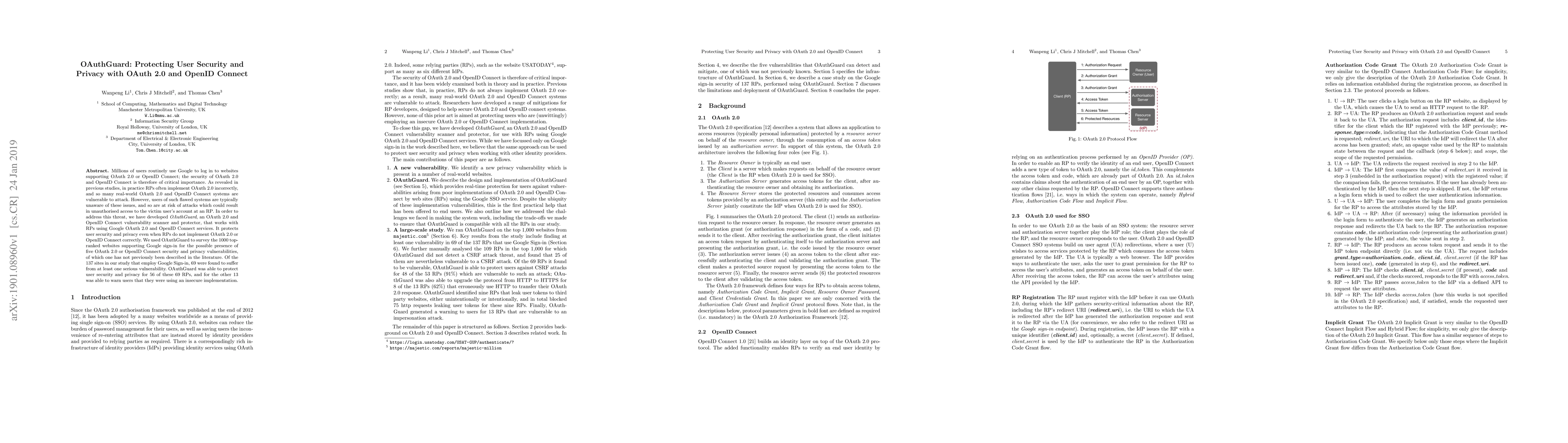 OAuthGuard is a tool designed to protect user security and privacy by scanning and addressing vulnerabilities in OAuth 2.0 and OpenID Connect implementations, particularly when relying on Google services. It was tested on 1,000 top-ranked websites, finding that 69 of those employing Google Sign-in had serious vulnerabilities, with OAuthGuard successfully protecting 56 or warning users about the insecure implementations.