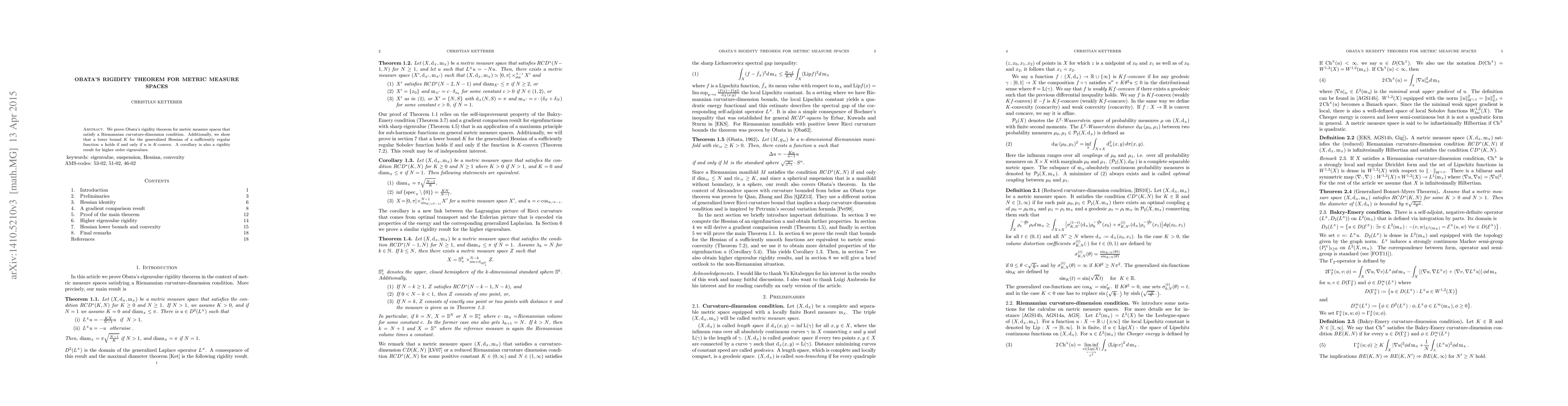 Obata's rigidity theorem is proven for metric measure spaces meeting a Riemannian curvature-dimension condition, and it is shown that a lower bound for the generalized Hessian of a sufficiently regular function implies $K$-convexity. A corollary establishes a rigidity result for higher order eigenvalues.