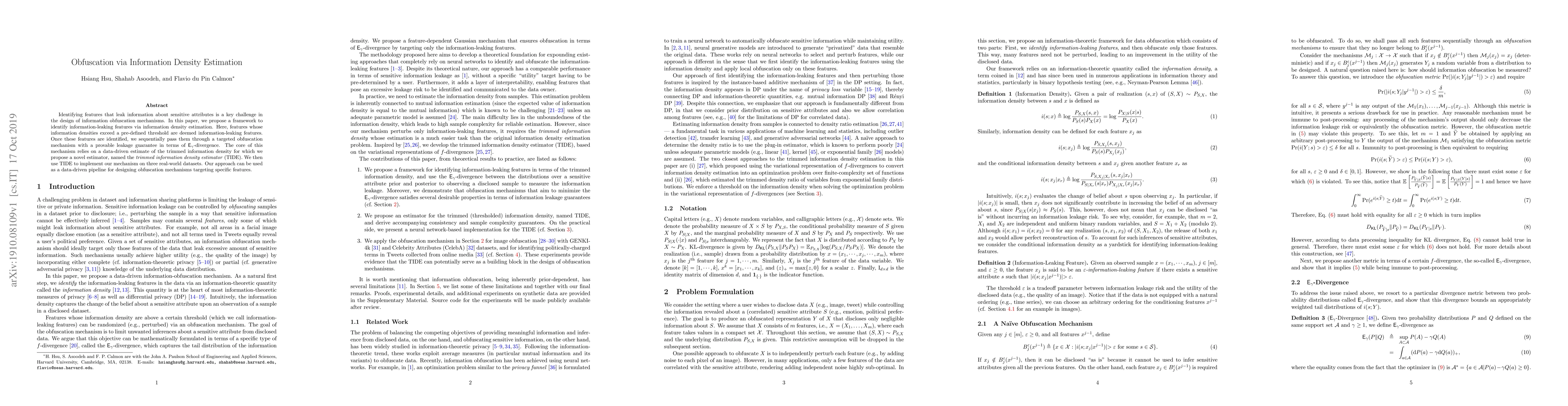 This paper proposes a framework to identify and obfuscate information-leaking features using information density estimation, introducing a novel trimmed information density estimator (TIDE) to achieve this. The method ensures a provable leakage guarantee and is demonstrated on three real-world datasets.