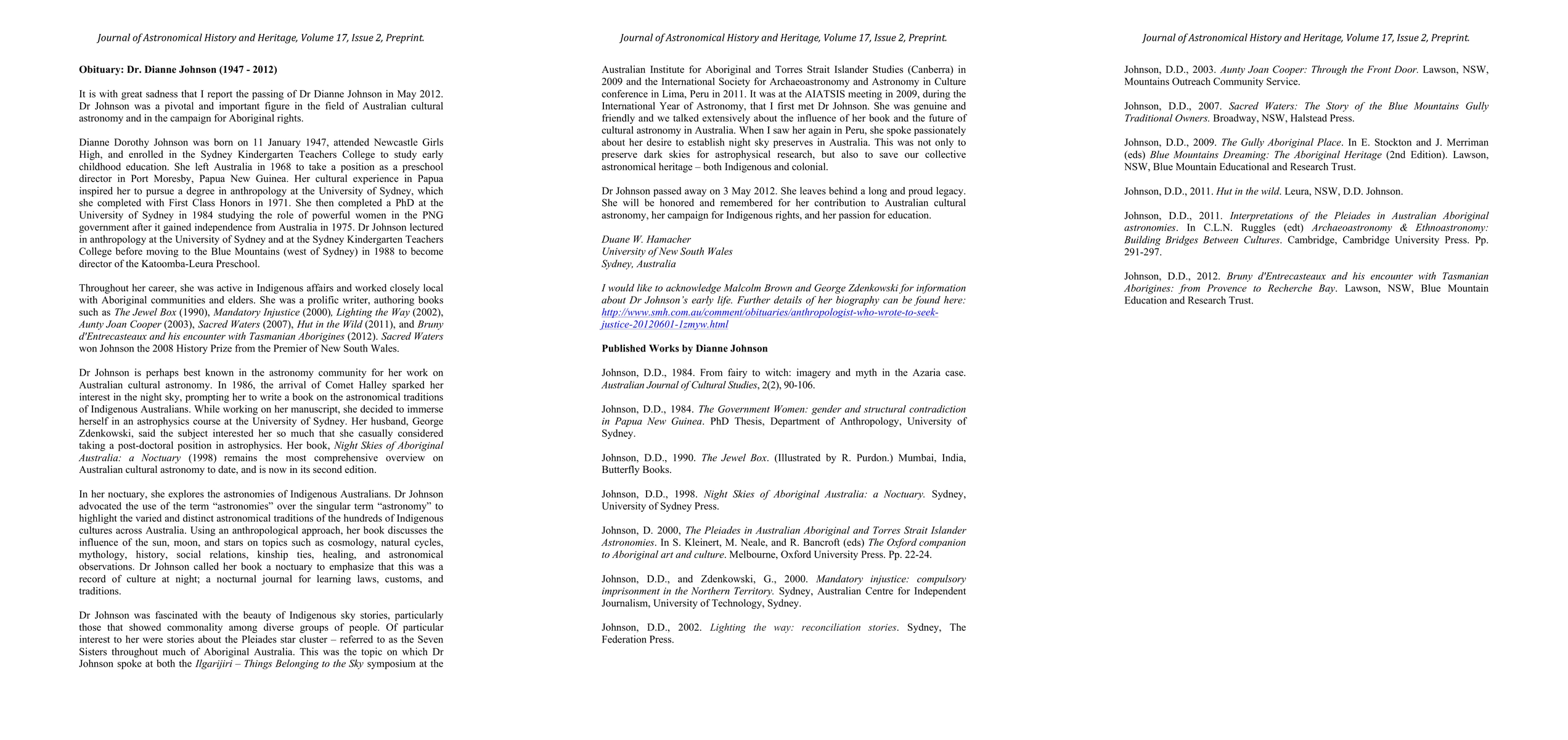 It is with great sadness that I report the passing of Dr Dianne Johnson in May 2012. Dr Johnson was a pivotal and important figure in the field of Australian cultural astronomy and in the campaign for Aboriginal rights.