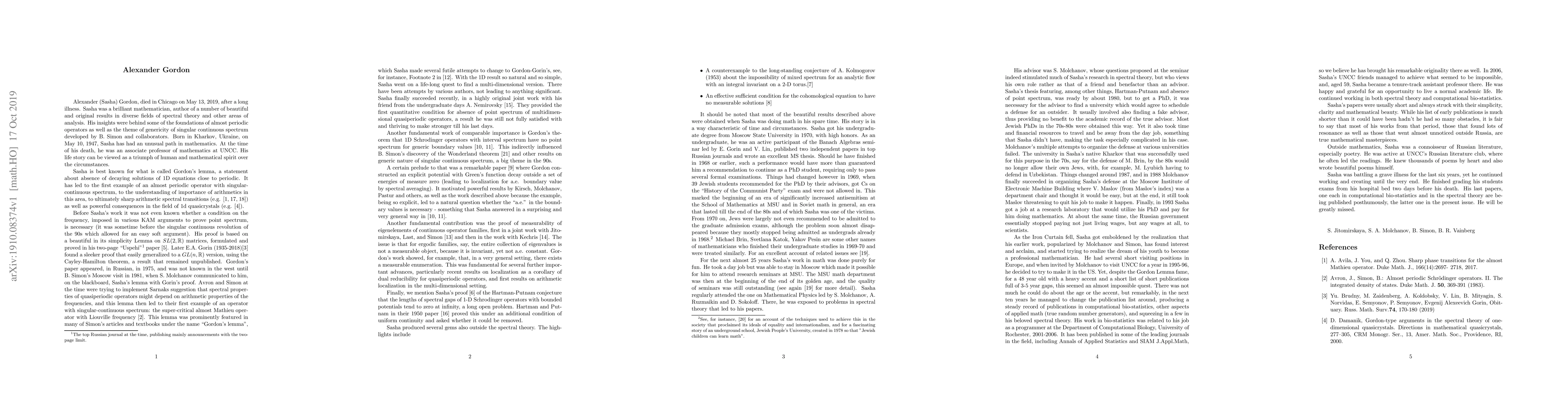 Title: Obituary of Alexander Gordon Summary: This obituary commemorates Alexander Gordon, a distinguished figure in the field of spectral theory, highlighting his significant contributions and his lasting impact on mathematical research and education.