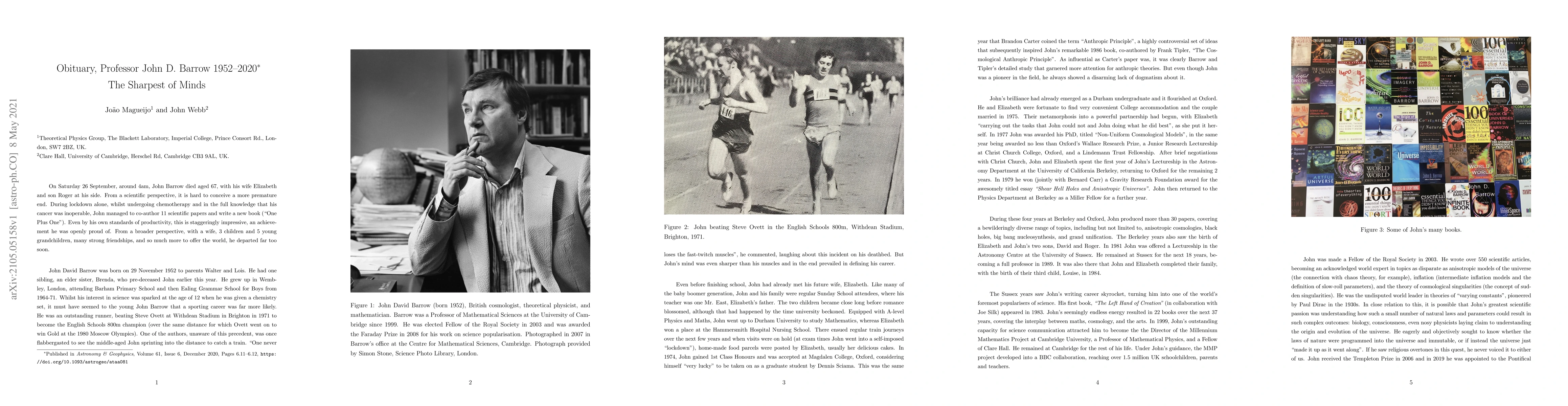 On Saturday 26 September, around 4am, John Barrow died aged 67, with his wife Elizabeth and son Roger at his side. From a scientific perspective, it is hard to conceive a more premature end. During lockdown alone, whilst undergoing chemotherapy and in the full knowledge that his cancer was inoperable, John managed to co-author 11 scientific papers and write a new book ("One Plus One"). Even by his own standards of productivity, this is staggeringly impressive, an achievement he was openly proud of. From a broader perspective, with a wife, 3 children and 5 young grandchildren, many strong friendships, and so much more to offer the world, he departed far too soon.