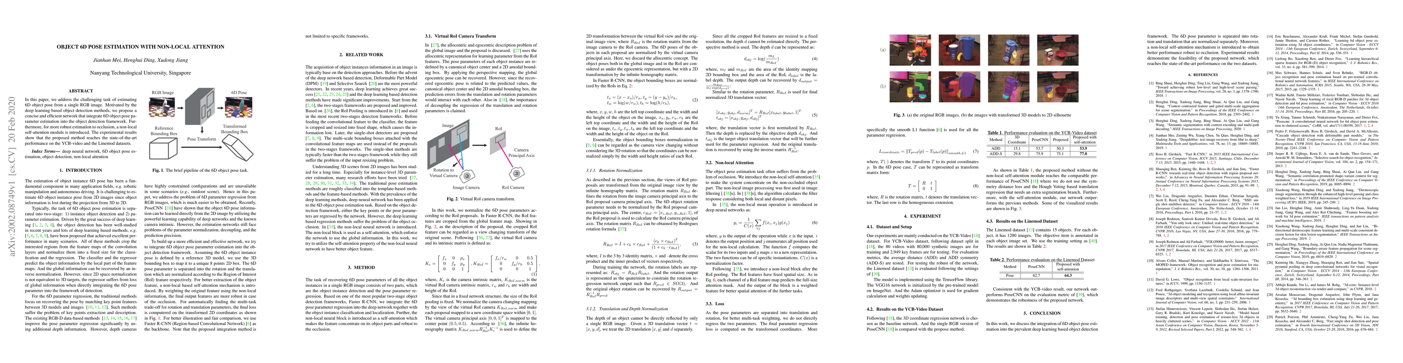This paper proposes an efficient network for estimating 6D object pose from a single RGB image, integrating pose estimation into object detection and employing a non-local self-attention module to enhance robustness against occlusion. The method achieves state-of-the-art performance on the YCB-video and Linemod datasets.