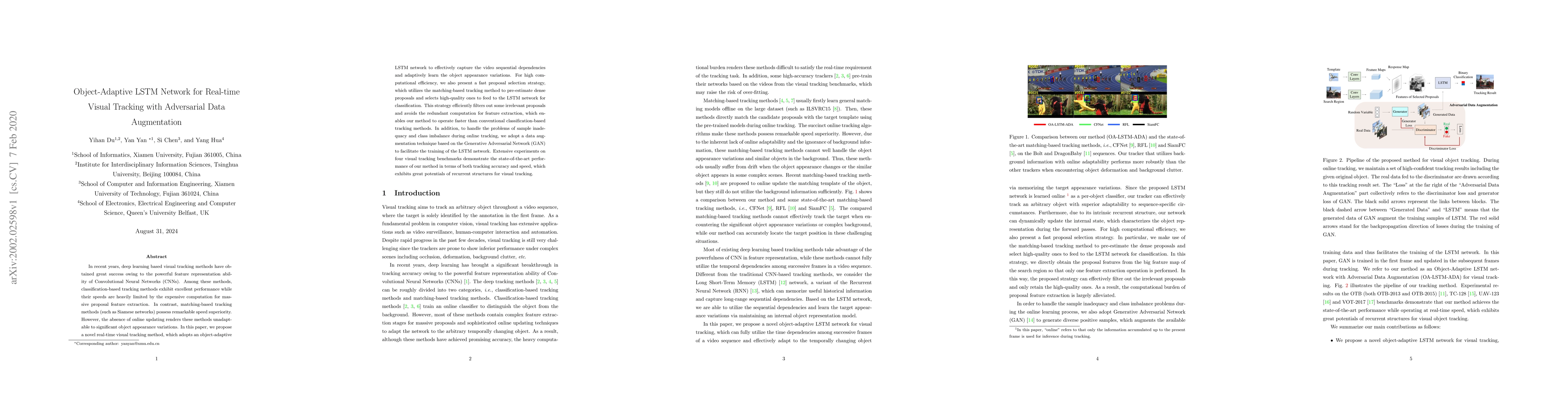 This paper proposes a real-time visual tracking method using an object-adaptive LSTM network that captures sequential dependencies and learns object appearance variations. To enhance computational efficiency, it employs a fast proposal selection strategy and uses adversarial data augmentation to address sample inadequacy and class imbalance, achieving state-of-the-art performance in both accuracy and speed.