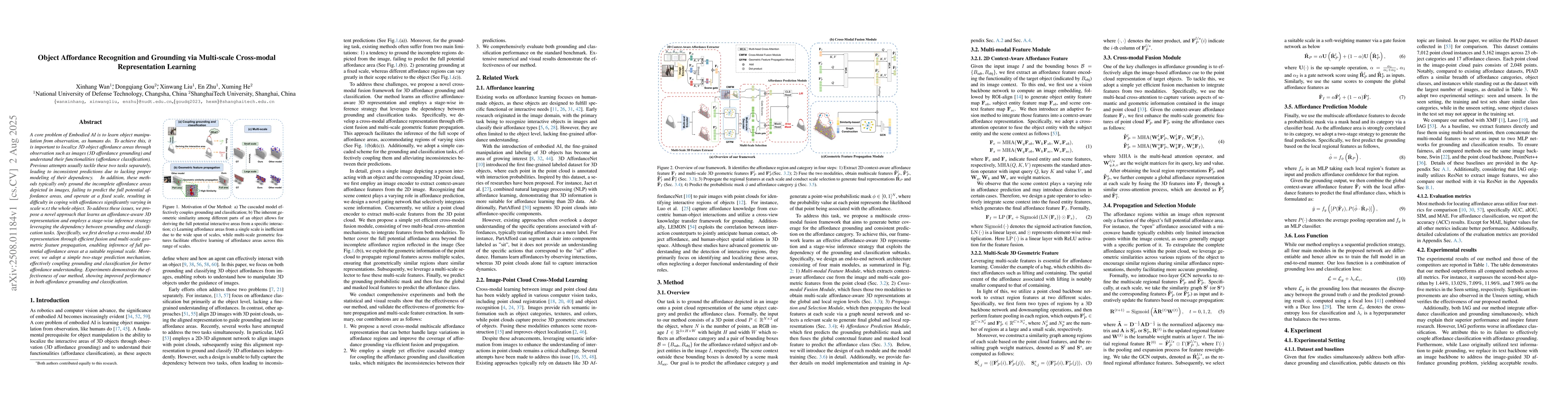 A core problem of Embodied AI is to learn object manipulation from observation, as humans do. To achieve this, it is important to localize 3D object affordance areas through observation such as images (3D affordance grounding) and understand their functionalities (affordance classification). Previous attempts usually tackle these two tasks separately, leading to inconsistent predictions due to lacking proper modeling of their dependency. In addition, these methods typically only ground the incomplete affordance areas depicted in images, failing to predict the full potential affordance areas, and operate at a fixed scale, resulting in difficulty in coping with affordances significantly varying in scale with respect to the whole object. To address these issues, we propose a novel approach that learns an affordance-aware 3D representation and employs a stage-wise inference strategy leveraging the dependency between grounding and classification tasks. Specifically, we first develop a cross-modal 3D representation through efficient fusion and multi-scale geometric feature propagation, enabling inference of full potential affordance areas at a suitable regional scale. Moreover, we adopt a simple two-stage prediction mechanism, effectively coupling grounding and classification for better affordance understanding. Experiments demonstrate the effectiveness of our method, showing improved performance in both affordance grounding and classification.
