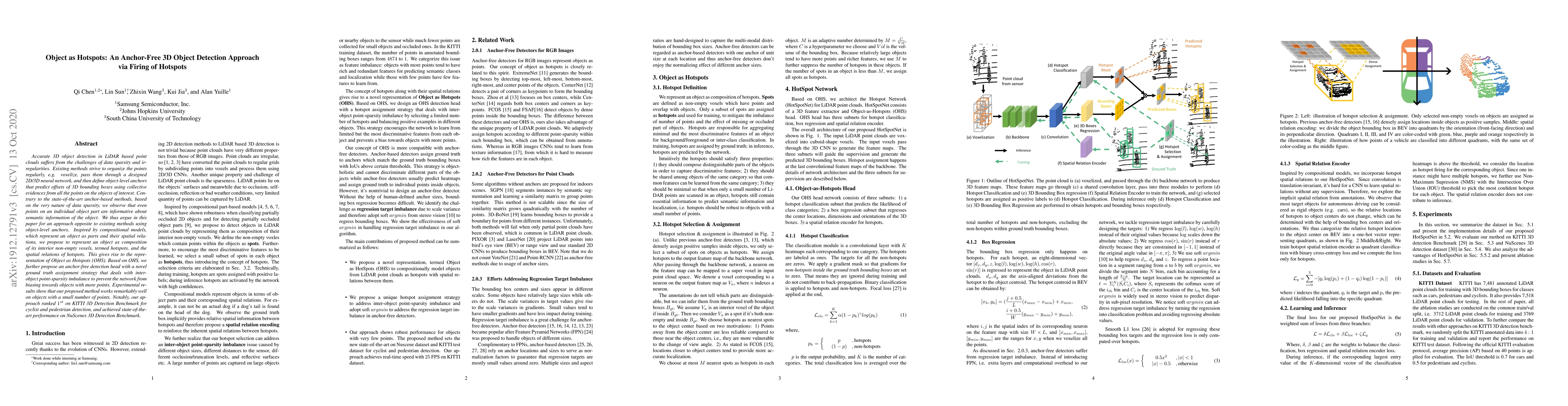 This paper proposes an anchor-free 3D object detection method termed Object as Hotspots (OHS), which represents objects as compositions of their non-empty voxels (hotspots) and their spatial relations. This approach effectively addresses data sparsity and outperforms existing anchor-based methods, achieving top results on KITTI and Nuscenes benchmarks.