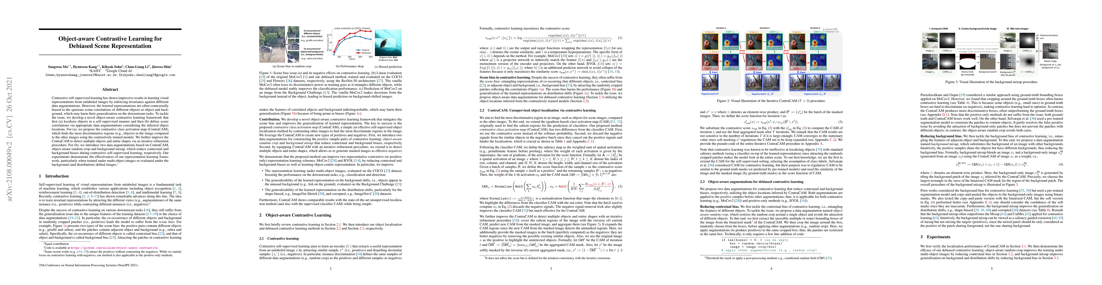 This paper proposes an object-aware contrastive learning framework to debias visual representations from unlabeled images by localizing objects and reducing contextual biases through specialized data augmentations. The method uses Contrastive Class Activation Maps (ContraCAM) and iterative refinement to detect objects, and introduces object-aware random crop and background mixup to mitigate scene correlations biases.