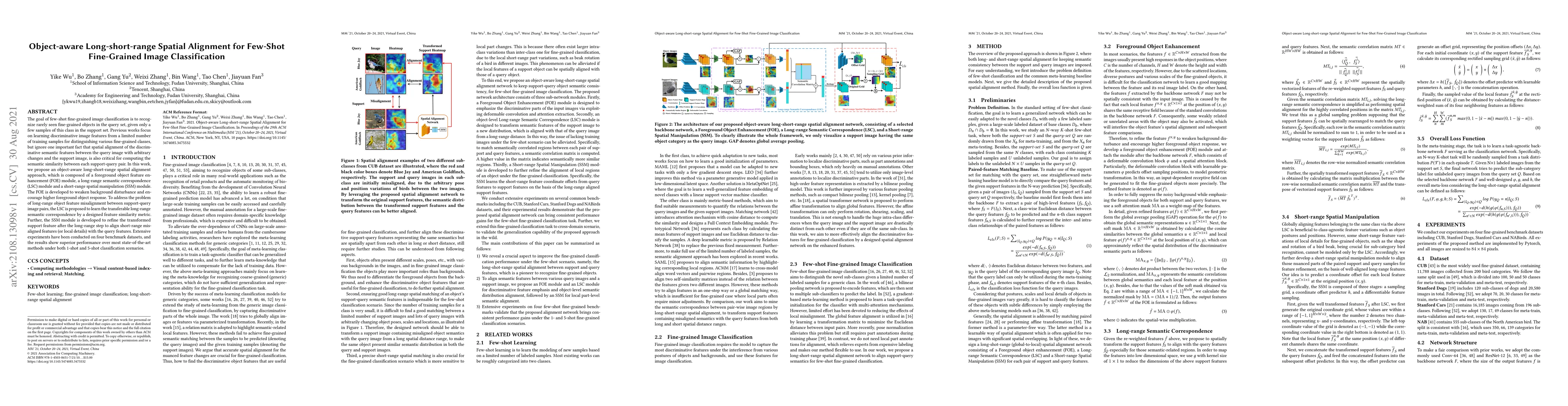 This paper proposes an object-aware long-short-range spatial alignment approach for few-shot fine-grained image classification, comprising modules for foreground enhancement, long-range semantic correspondence, and short-range spatial manipulation to improve feature alignment and classification accuracy. Experiments demonstrate superior performance over state-of-the-art methods on benchmark datasets.