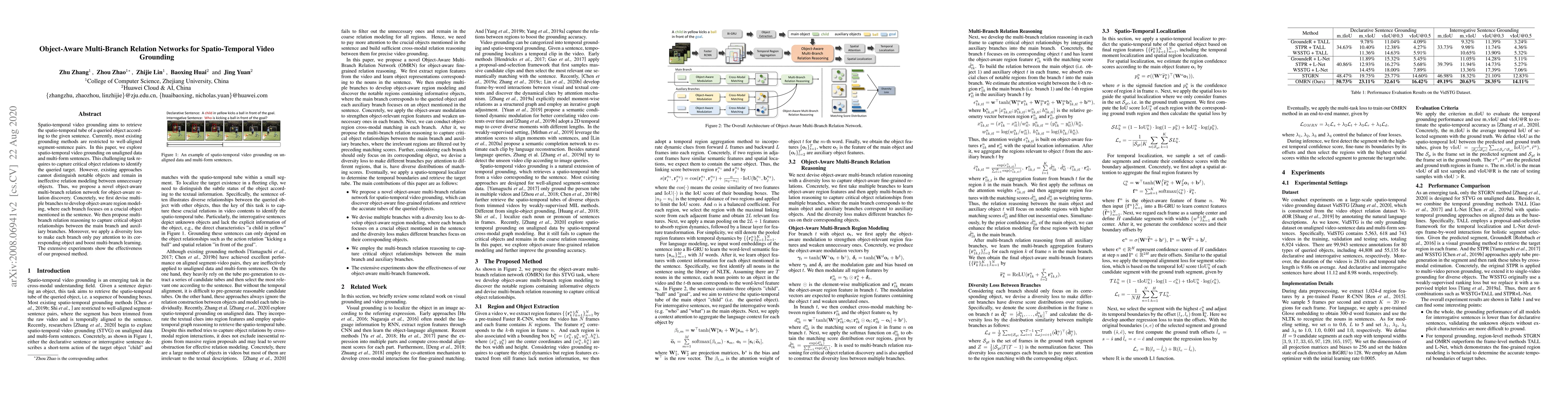 This paper proposes an object-aware multi-branch relation network to address the challenge of spatio-temporal video grounding in unaligned data and multi-form sentences. The approach involves multiple branches to focus on crucial objects and diverse loss functions to enhance relation modeling and object distinction.