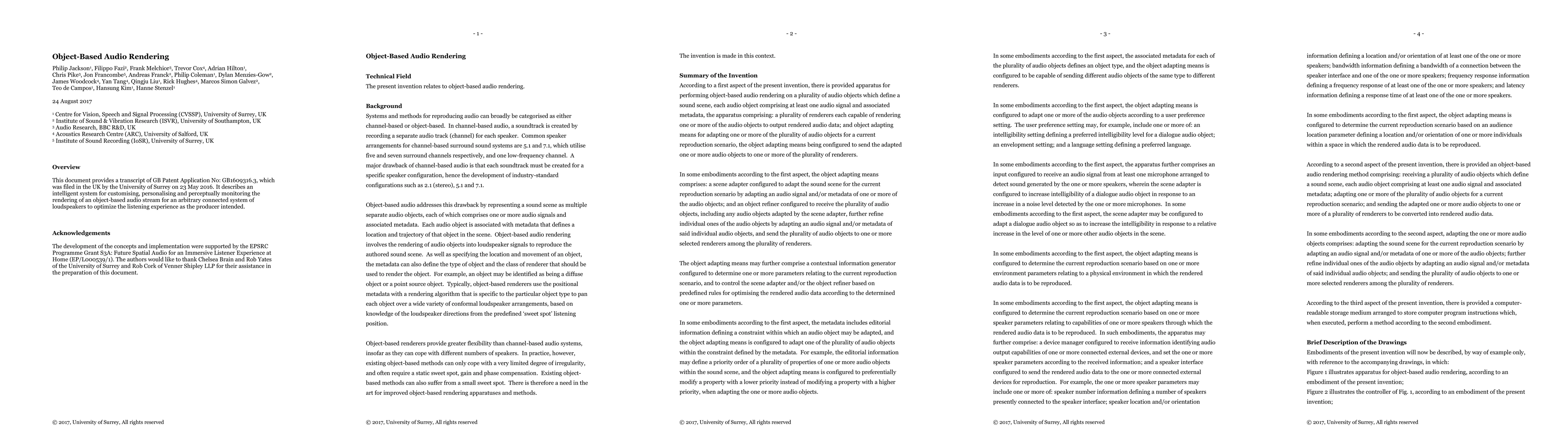 This paper presents methods and apparatus for object-based audio rendering, where multiple audio objects with associated metadata are rendered to produce a sound scene. The system includes renderers and object adapting means to customize audio objects for specific playback scenarios.
