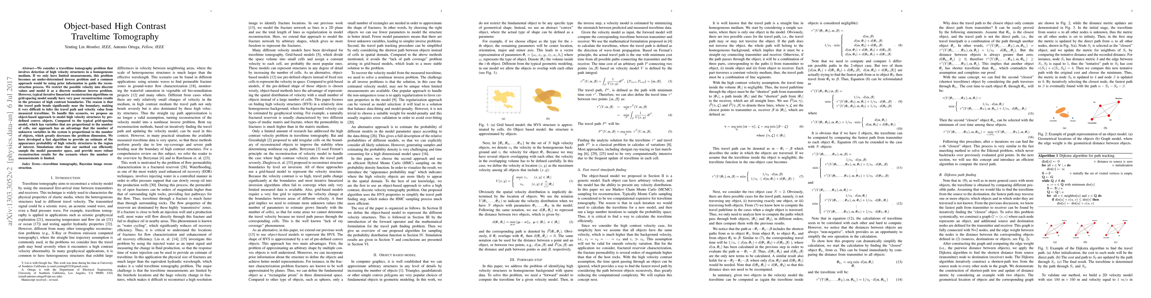This paper proposes an object-based high contrast travel time tomography method to detect discrete high velocity structures, addressing the limitations of traditional grid-based models. The new reconstruction algorithm efficiently estimates the probability of high velocity structures' presence, generating a "probability map" that highlights the most likely regions of such structures.