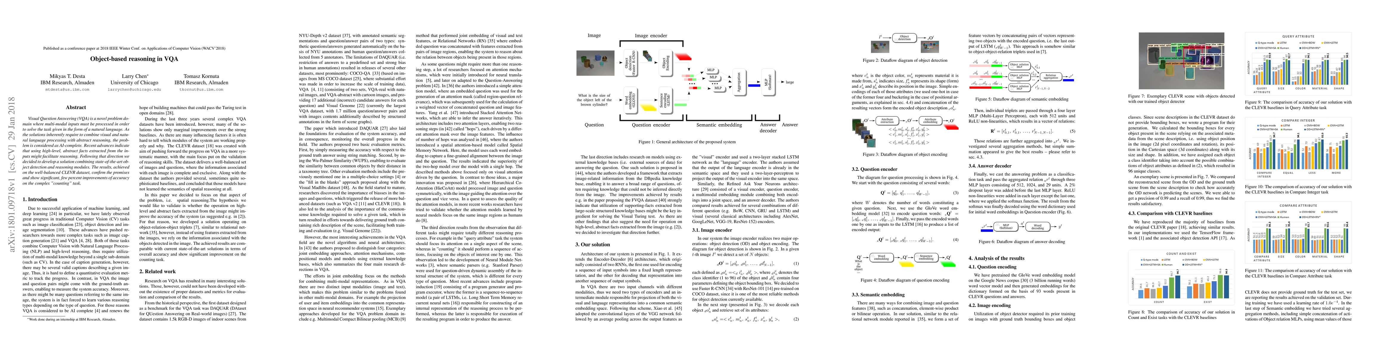 Visual Question Answering (VQA) is a novel problem domain where multi-modal inputs must be processed in order to solve the task given in the form of a natural language. As the solutions inherently require to combine visual and natural language processing with abstract reasoning, the problem is considered as AI-complete. Recent advances indicate that using high-level, abstract facts extracted from the inputs might facilitate reasoning. Following that direction we decided to develop a solution combining state-of-the-art object detection and reasoning modules. The results, achieved on the well-balanced CLEVR dataset, confirm the promises and show significant, few percent improvements of accuracy on the complex "counting" task.