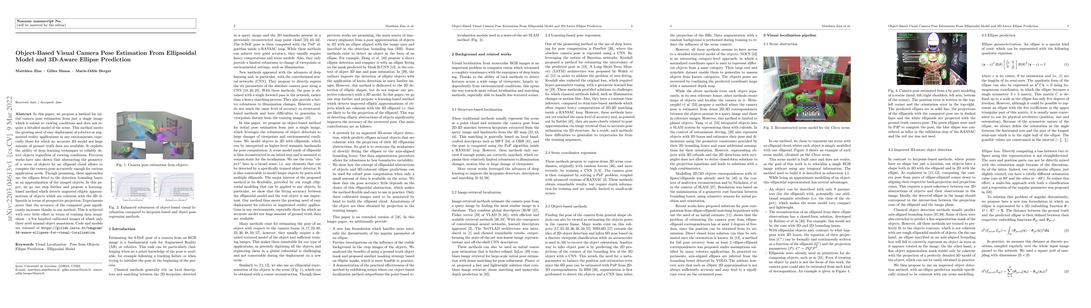 In this paper, we propose a method for initial camera pose estimation from just a single image which is robust to viewing conditions and does not require a detailed model of the scene. This method meets the growing need of easy deployment of robotics or augmented reality applications in any environments, especially those for which no accurate 3D model nor huge amount of ground truth data are available. It exploits the ability of deep learning techniques to reliably detect objects regardless of viewing conditions. Previous works have also shown that abstracting the geometry of a scene of objects by an ellipsoid cloud allows to compute the camera pose accurately enough for various application needs. Though promising, these approaches use the ellipses fitted to the detection bounding boxes as an approximation of the imaged objects. In this paper, we go one step further and propose a learning-based method which detects improved elliptic approximations of objects which are coherent with the 3D ellipsoids in terms of perspective projection. Experiments prove that the accuracy of the computed pose significantly increases thanks to our method. This is achieved with very little effort in terms of training data acquisition - a few hundred calibrated images of which only three need manual object annotation. Code and models are released at https://gitlab.inria.fr/tangram/3d-aware-ellipses-for-visual-localization