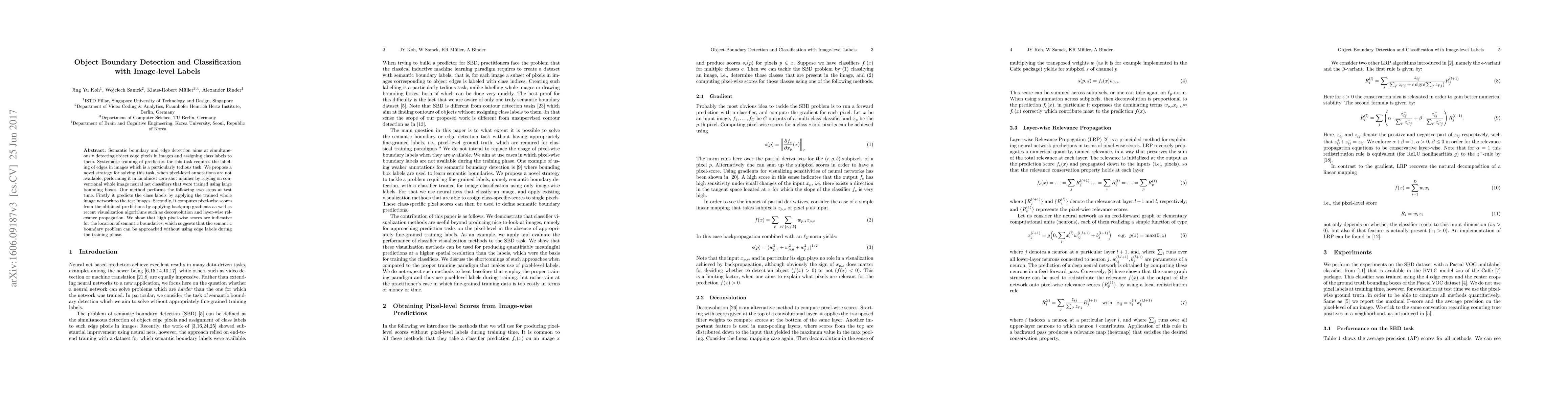 This paper proposes a novel zero-shot method for object boundary detection and classification using image-level labels. It leverages whole image classifiers and backprop gradients to predict class labels and compute pixel-wise scores, indicating semantic boundaries without requiring pixel-level annotations.