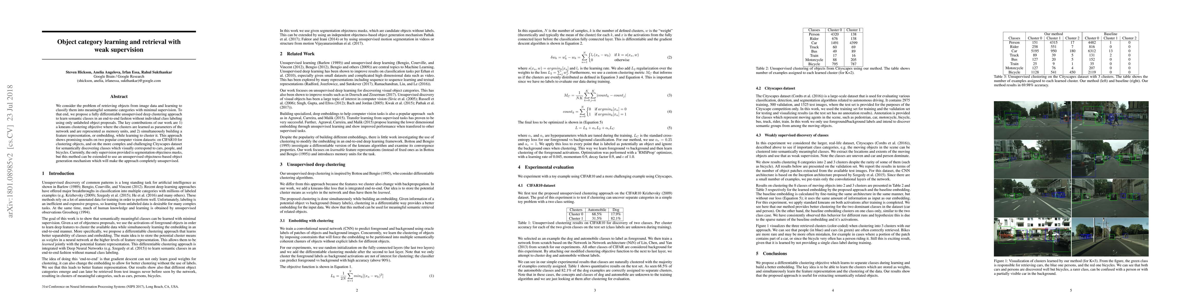 We consider the problem of retrieving objects from image data and learning to classify them into meaningful semantic categories with minimal supervision. To that end, we propose a fully differentiable unsupervised deep clustering approach to learn semantic classes in an end-to-end fashion without individual class labeling using only unlabeled object proposals. The key contributions of our work are 1) a kmeans clustering objective where the clusters are learned as parameters of the network and are represented as memory units, and 2) simultaneously building a feature representation, or embedding, while learning to cluster it. This approach shows promising results on two popular computer vision datasets: on CIFAR10 for clustering objects, and on the more complex and challenging Cityscapes dataset for semantically discovering classes which visually correspond to cars, people, and bicycles. Currently, the only supervision provided is segmentation objectness masks, but this method can be extended to use an unsupervised objectness-based object generation mechanism which will make the approach completely unsupervised.