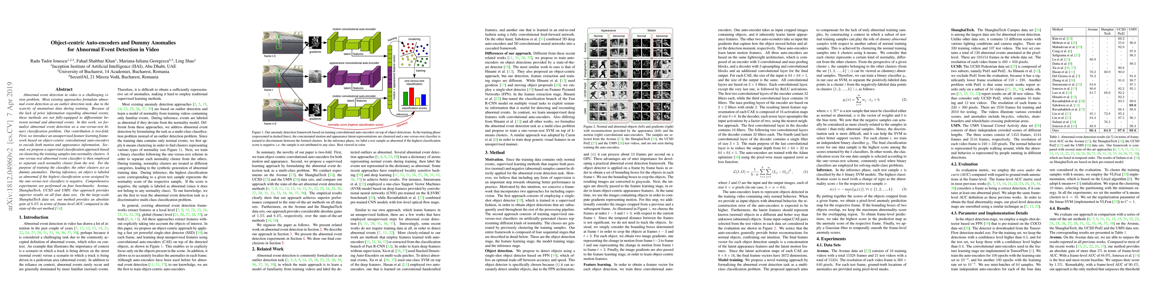 This paper proposes an unsupervised framework for abnormal event detection in video using object-centric convolutional auto-encoders to learn features and a one-versus-rest classification approach to identify anomalies, achieving superior results on four benchmark datasets. The method shows an 8.4% improvement in frame-level AUC on the ShanghaiTech dataset compared to the state-of-the-art.