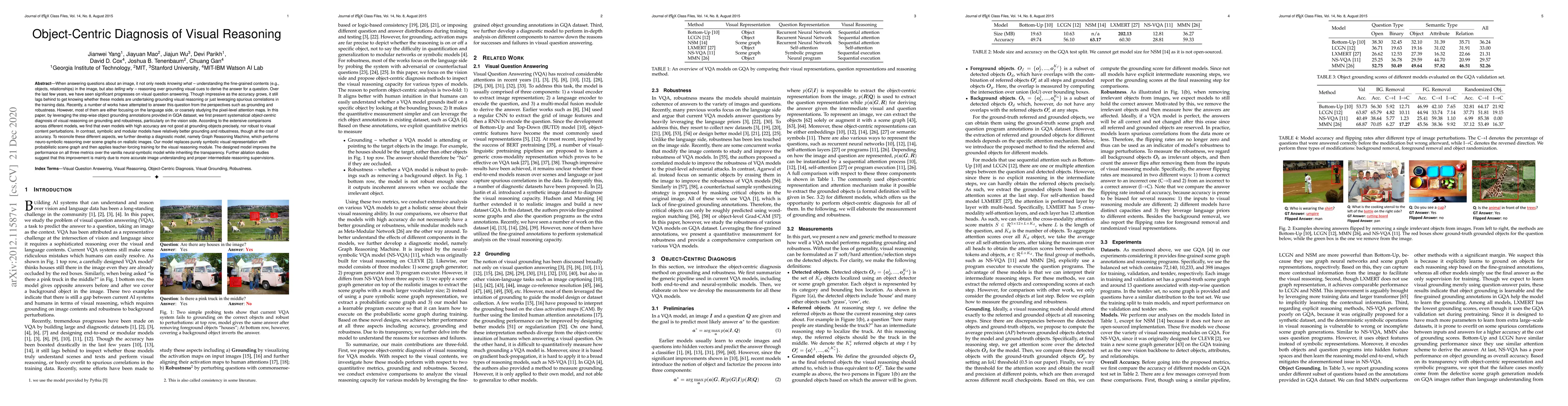 This paper presents an object-centric diagnosis of visual reasoning in visual question answering models, revealing that high-accuracy models often rely on spurious correlations rather than precise grounding and robustness. It introduces the Graph Reasoning Machine, a model that combines probabilistic scene graphs and teacher-forcing to improve performance while maintaining transparency, balancing accuracy, grounding, and robustness.