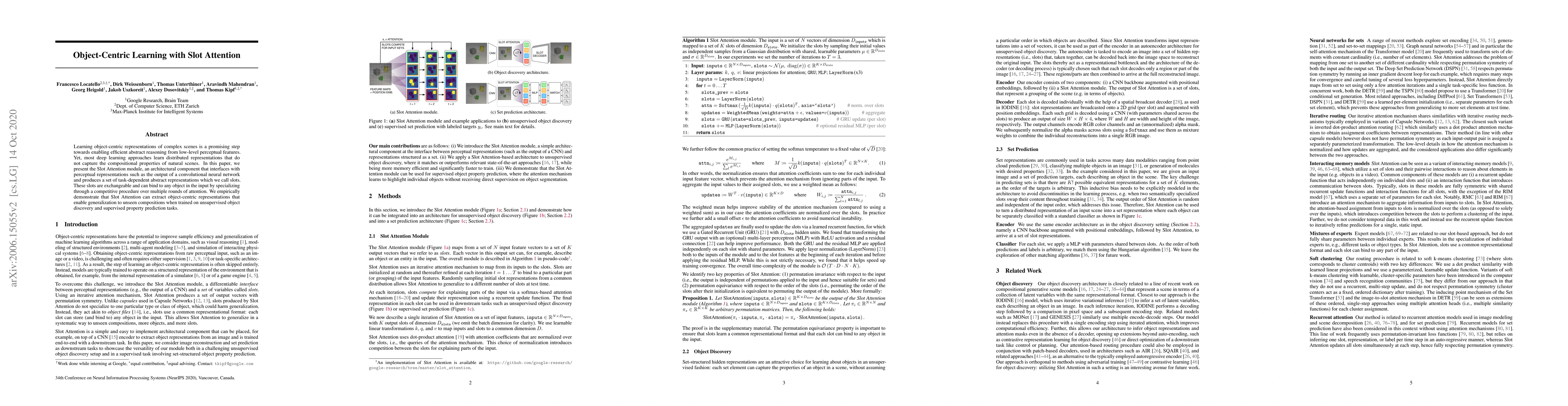 This paper introduces the Slot Attention module to create object-centric representations from complex scenes, enabling efficient reasoning from low-level features. It demonstrates that the module can generalize to unseen compositions through unsupervised object discovery and supervised property prediction tasks.