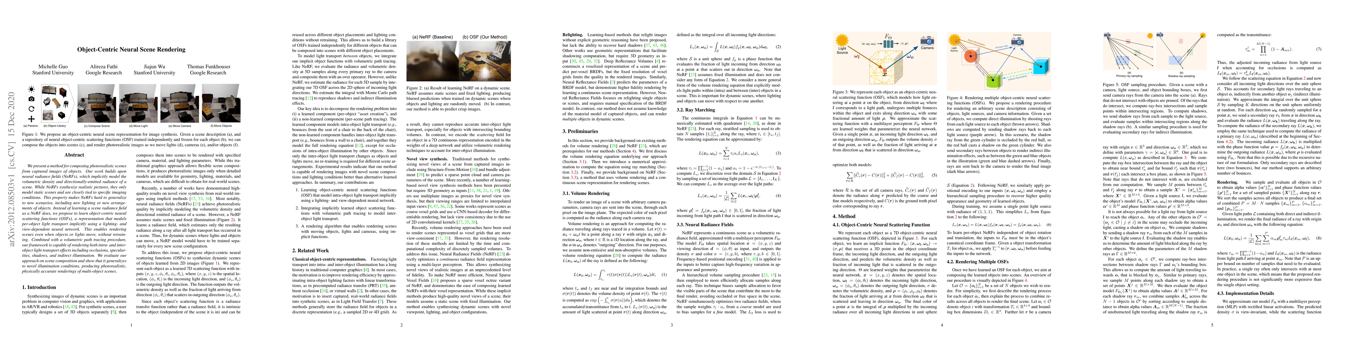 This paper proposes a method for rendering photorealistic scenes by learning object-centric neural scattering functions (OSFs) instead of neural radiance fields (NeRFs), enabling dynamic scene composition and generalization to new lighting conditions without retraining. The approach combines OSFs with volumetric path tracing to accurately render complex light interactions.
