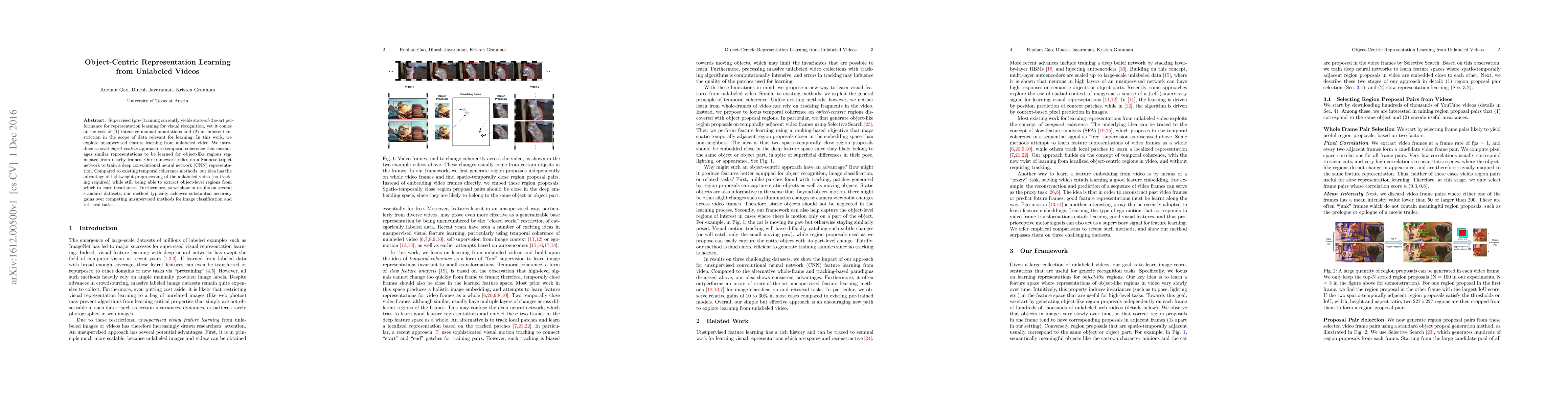This paper proposes an unsupervised method for object-centric representation learning from unlabeled videos using a Siamese-triplet network. It achieves temporal coherence without intensive annotations or tracking, leading to significant accuracy gains in image classification and retrieval compared to other unsupervised methods.