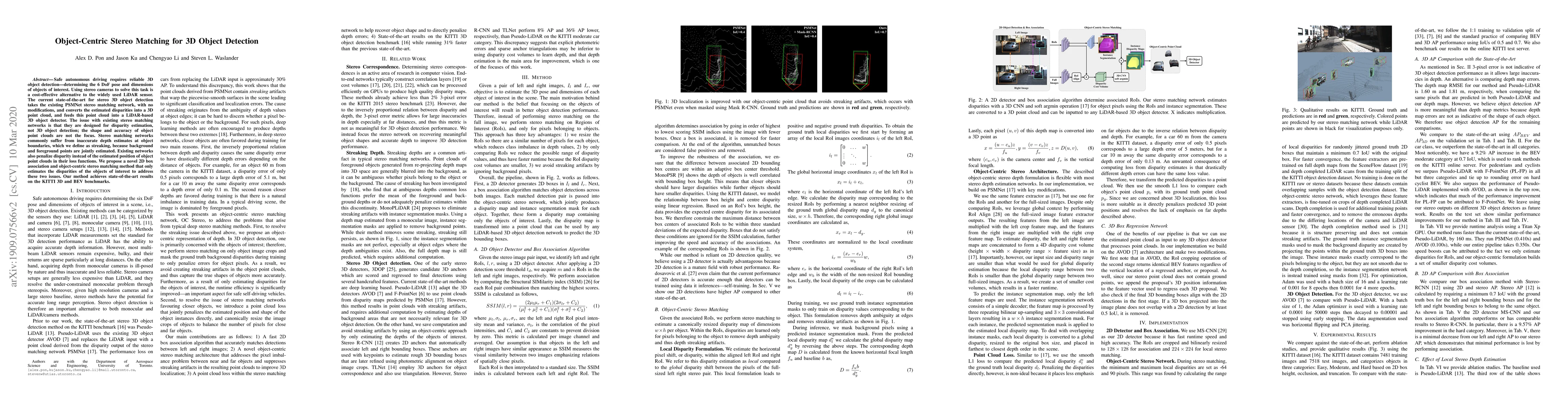 Safe autonomous driving requires reliable 3D object detection-determining the 6 DoF pose and dimensions of objects of interest. Using stereo cameras to solve this task is a cost-effective alternative to the widely used LiDAR sensor. The current state-of-the-art for stereo 3D object detection takes the existing PSMNet stereo matching network, with no modifications, and converts the estimated disparities into a 3D point cloud, and feeds this point cloud into a LiDAR-based 3D object detector. The issue with existing stereo matching networks is that they are designed for disparity estimation, not 3D object detection; the shape and accuracy of object point clouds are not the focus. Stereo matching networks commonly suffer from inaccurate depth estimates at object boundaries, which we define as streaking, because background and foreground points are jointly estimated. Existing networks also penalize disparity instead of the estimated position of object point clouds in their loss functions. We propose a novel 2D box association and object-centric stereo matching method that only estimates the disparities of the objects of interest to address these two issues. Our method achieves state-of-the-art results on the KITTI 3D and BEV benchmarks.