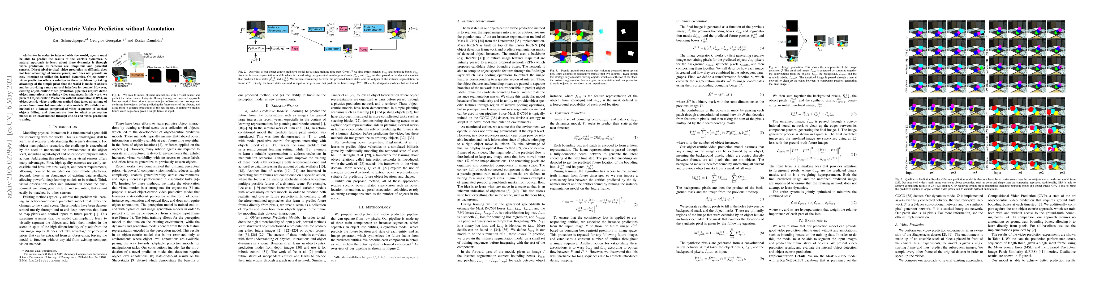 In order to interact with the world, agents must be able to predict the results of the world's dynamics. A natural approach to learn about these dynamics is through video prediction, as cameras are ubiquitous and powerful sensors. Direct pixel-to-pixel video prediction is difficult, does not take advantage of known priors, and does not provide an easy interface to utilize the learned dynamics. Object-centric video prediction offers a solution to these problems by taking advantage of the simple prior that the world is made of objects and by providing a more natural interface for control. However, existing object-centric video prediction pipelines require dense object annotations in training video sequences. In this work, we present Object-centric Prediction without Annotation (OPA), an object-centric video prediction method that takes advantage of priors from powerful computer vision models. We validate our method on a dataset comprised of video sequences of stacked objects falling, and demonstrate how to adapt a perception model in an environment through end-to-end video prediction training.
