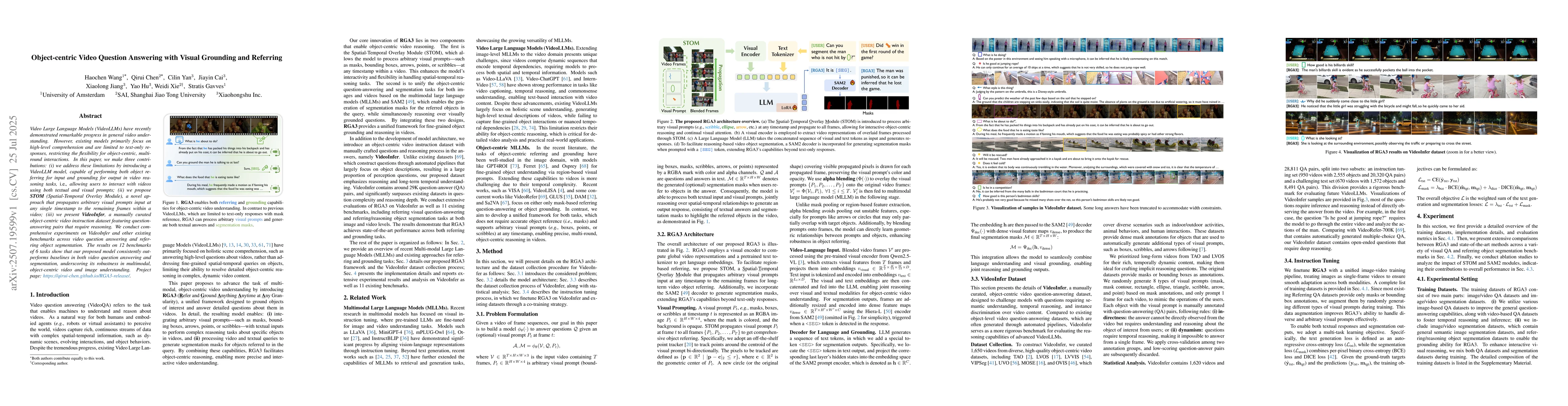 Video Large Language Models (VideoLLMs) have recently demonstrated remarkable progress in general video understanding. However, existing models primarily focus on high-level comprehension and are limited to text-only responses, restricting the flexibility for object-centric, multiround interactions. In this paper, we make three contributions: (i) we address these limitations by introducing a VideoLLM model, capable of performing both object referring for input and grounding for output in video reasoning tasks, i.e., allowing users to interact with videos using both textual and visual prompts; (ii) we propose STOM (Spatial-Temporal Overlay Module), a novel approach that propagates arbitrary visual prompts input at any single timestamp to the remaining frames within a video; (iii) we present VideoInfer, a manually curated object-centric video instruction dataset featuring questionanswering pairs that require reasoning. We conduct comprehensive experiments on VideoInfer and other existing benchmarks across video question answering and referring object segmentation. The results on 12 benchmarks of 6 tasks show that our proposed model consistently outperforms baselines in both video question answering and segmentation, underscoring its robustness in multimodal, object-centric video and image understanding. Project page: https://qirui-chen.github.io/RGA3-release/.