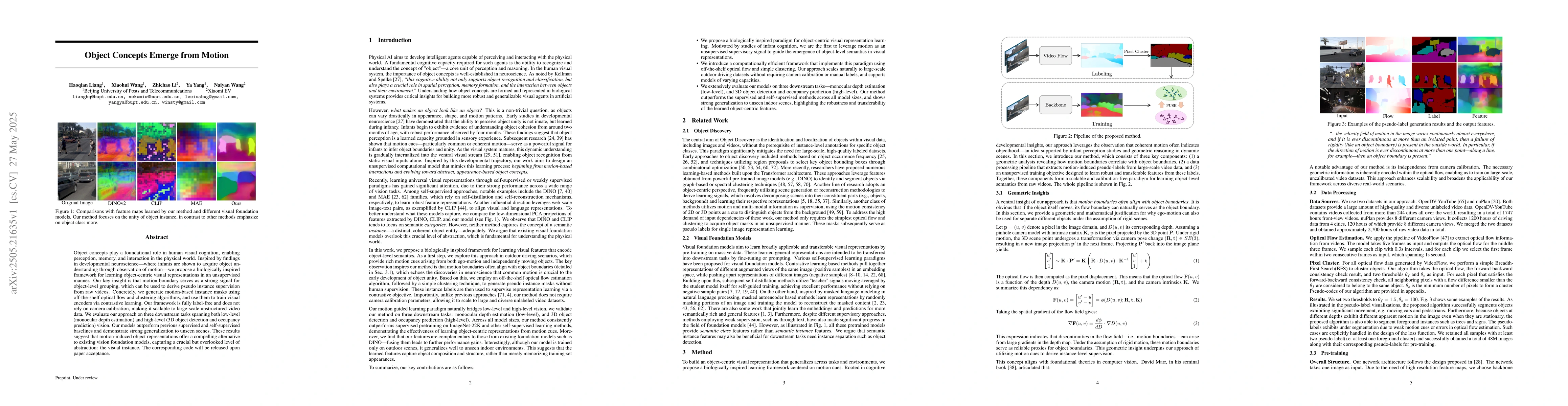 Object concepts play a foundational role in human visual cognition, enabling perception, memory, and interaction in the physical world. Inspired by findings in developmental neuroscience - where infants are shown to acquire object understanding through observation of motion - we propose a biologically inspired framework for learning object-centric visual representations in an unsupervised manner. Our key insight is that motion boundary serves as a strong signal for object-level grouping, which can be used to derive pseudo instance supervision from raw videos. Concretely, we generate motion-based instance masks using off-the-shelf optical flow and clustering algorithms, and use them to train visual encoders via contrastive learning. Our framework is fully label-free and does not rely on camera calibration, making it scalable to large-scale unstructured video data. We evaluate our approach on three downstream tasks spanning both low-level (monocular depth estimation) and high-level (3D object detection and occupancy prediction) vision. Our models outperform previous supervised and self-supervised baselines and demonstrate strong generalization to unseen scenes. These results suggest that motion-induced object representations offer a compelling alternative to existing vision foundation models, capturing a crucial but overlooked level of abstraction: the visual instance. The corresponding code will be released upon paper acceptance.