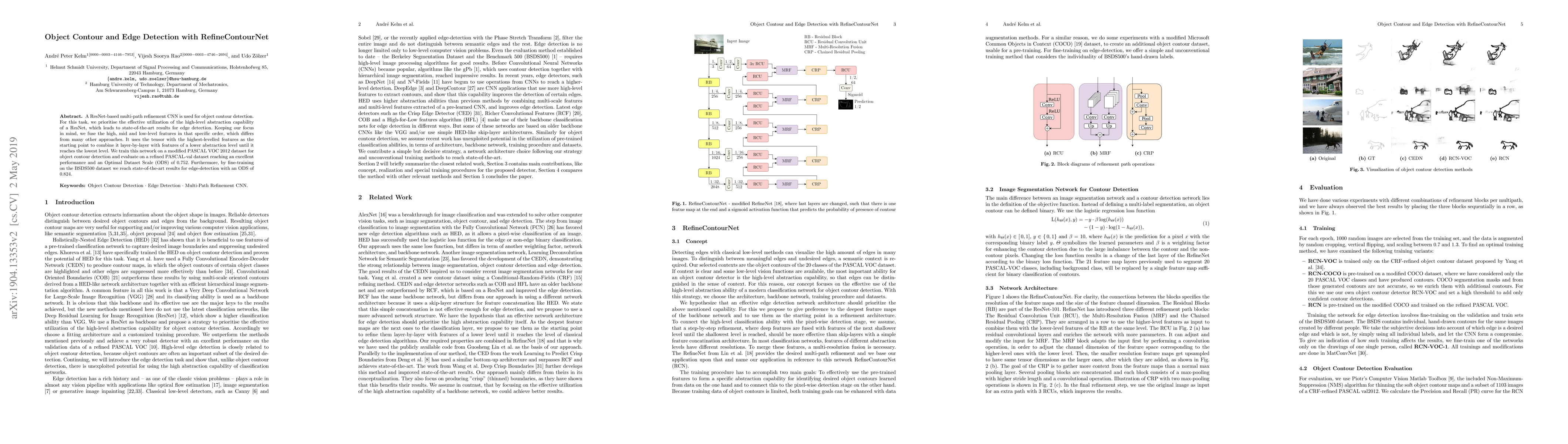 This paper proposes a ResNet-based multi-path refinement CNN called RefineContourNet for object contour and edge detection, achieving state-of-the-art results by fusing high, mid, and low-level features in a unique order. The model is trained and evaluated on modified PASCAL VOC 2012 and refined PASCAL-val datasets, and further fine-tuned on BSDS500 for edge detection.