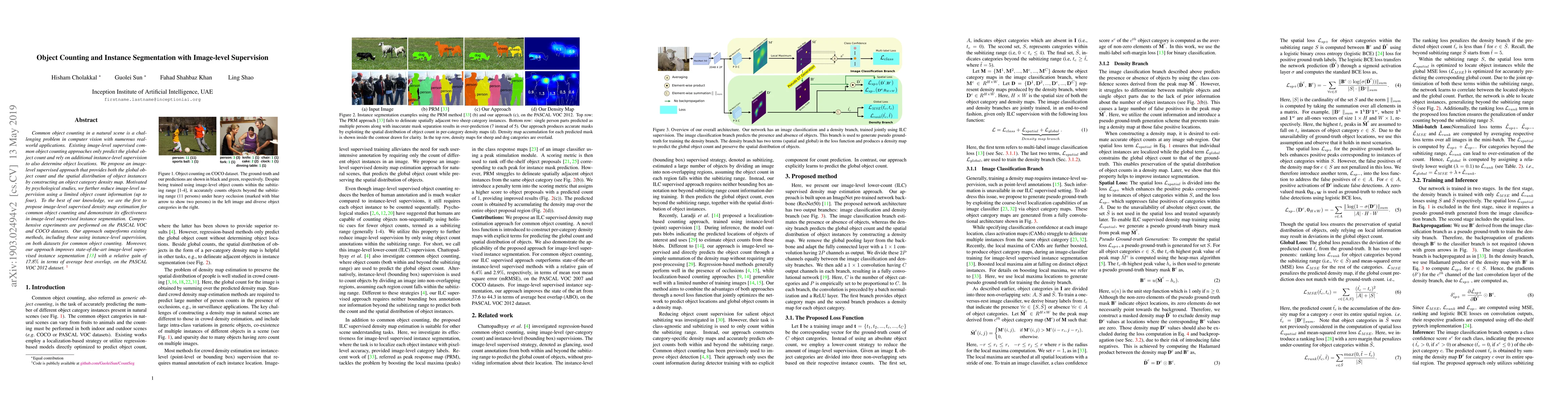 This paper proposes an image-level supervised method for both common object counting and instance segmentation, generating an object category density map to provide global object count and spatial distribution. The method reduces supervision by leveraging limited object count information, outperforming existing methods on PASCAL VOC and COCO datasets.
