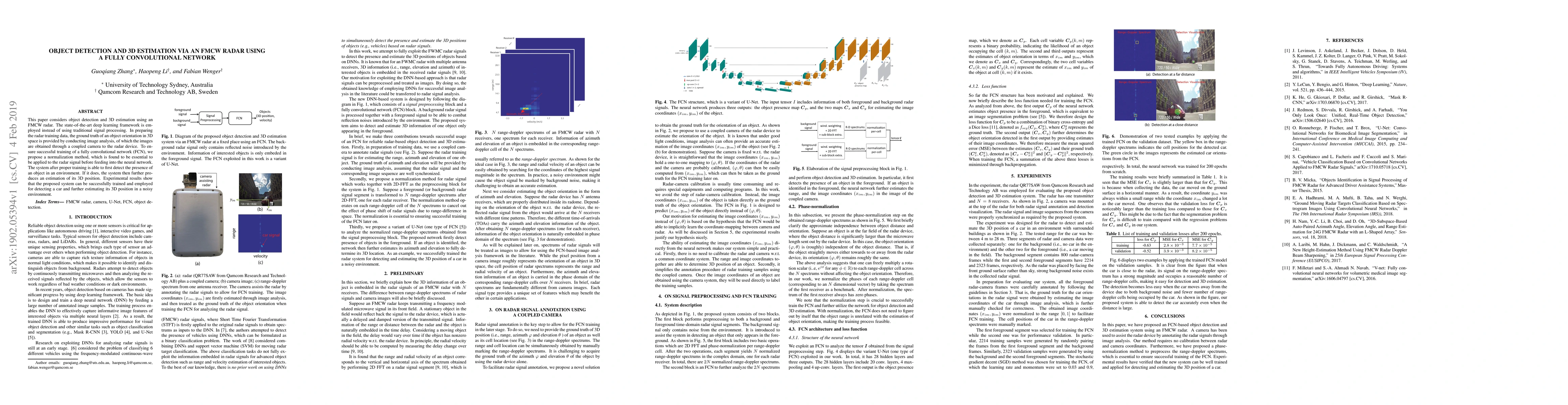 This paper proposes a method for object detection and 3D estimation using FMCW radar and a fully convolutional network (FCN). A normalization technique is introduced to prepare radar data for neural network training, enabling the system to detect objects and estimate their 3D positions effectively.