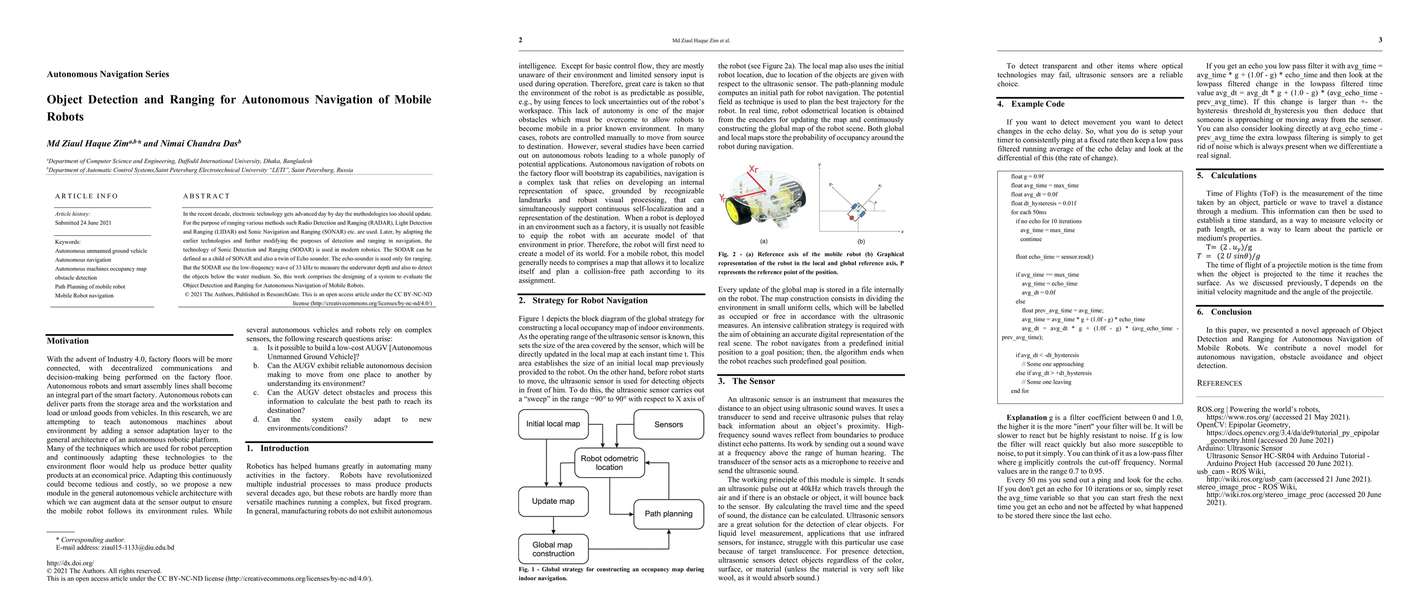 In the recent decade, electronic technology gets advanced day by day the methodologies too should update. For the purpose of ranging various methods such Radio Detection and Ranging (RADAR), Light Detection and Ranging (LIDAR) and Sonic Navigation and Ranging (SONAR) etc. are used. Later, by adapting the earlier technologies and further modifying the purposes of detection and ranging in navigation, the technology of Sonic Detection and Ranging (SODAR) is used in modern robotics. The SODAR can be defined as a child of SONAR and also a twin of Echo sounder. The echo-sounder is used only for ranging. But the SODAR use the low-frequency wave of 33 kHz to measure the underwater depth and also to detect the objects below the water medium. So, this work comprises the designing of a system to evaluate the Object Detection and Ranging for Autonomous Navigation of Mobile Robots.