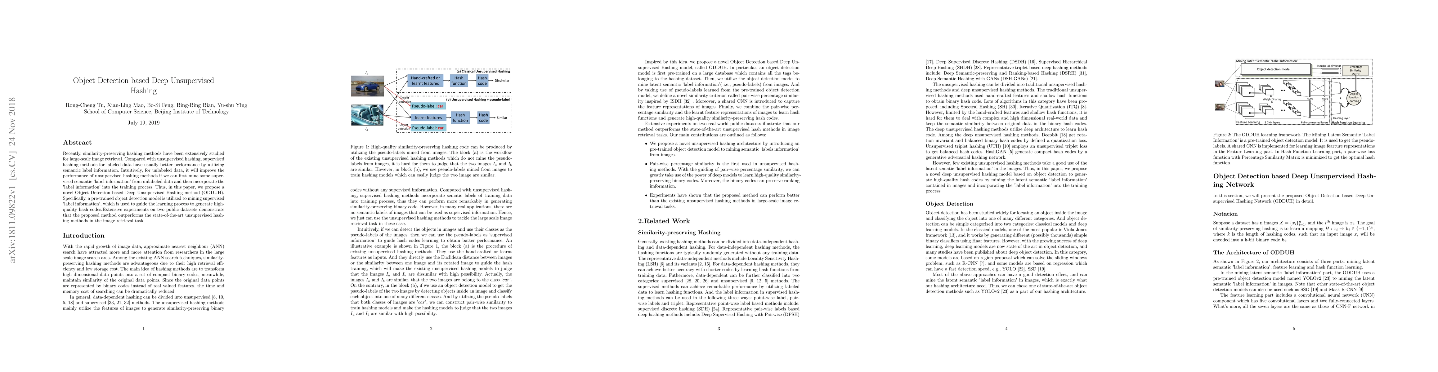 This paper proposes a novel Object Detection based Deep Unsupervised Hashing (ODDUH) method that leverages a pre-trained object detection model to extract supervised 'label information' from unlabeled data, enhancing the performance of unsupervised hashing for large-scale image retrieval. Experiments show that ODDUH outperforms state-of-the-art unsupervised hashing methods.