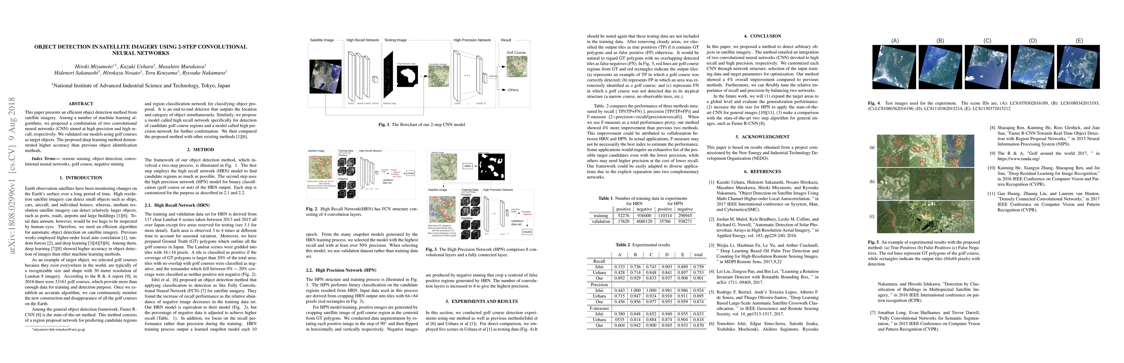 This paper proposes a two-step convolutional neural network (CNN) approach for object detection in satellite imagery, achieving higher accuracy than previous methods. The method was validated using golf courses as target objects, demonstrating improved precision and recall.