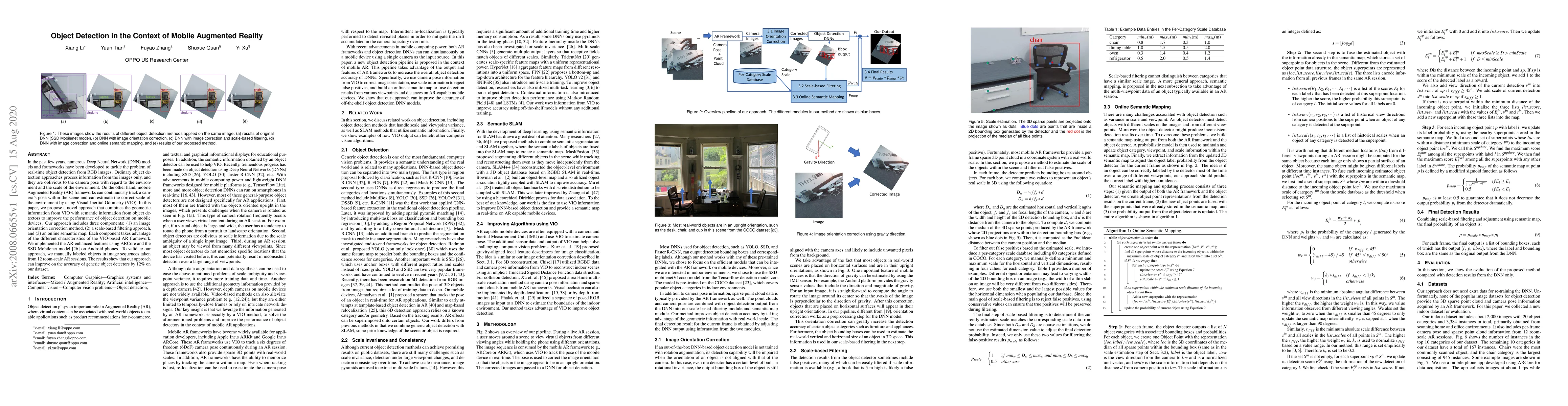 This paper proposes an enhanced object detection method for mobile Augmented Reality by integrating geometric information from Visual-Inertial Odometry with semantic data from object detectors, achieving a 12% accuracy improvement over generic detectors on a labeled dataset. The approach includes image orientation correction, scale-based filtering, and an online semantic map.