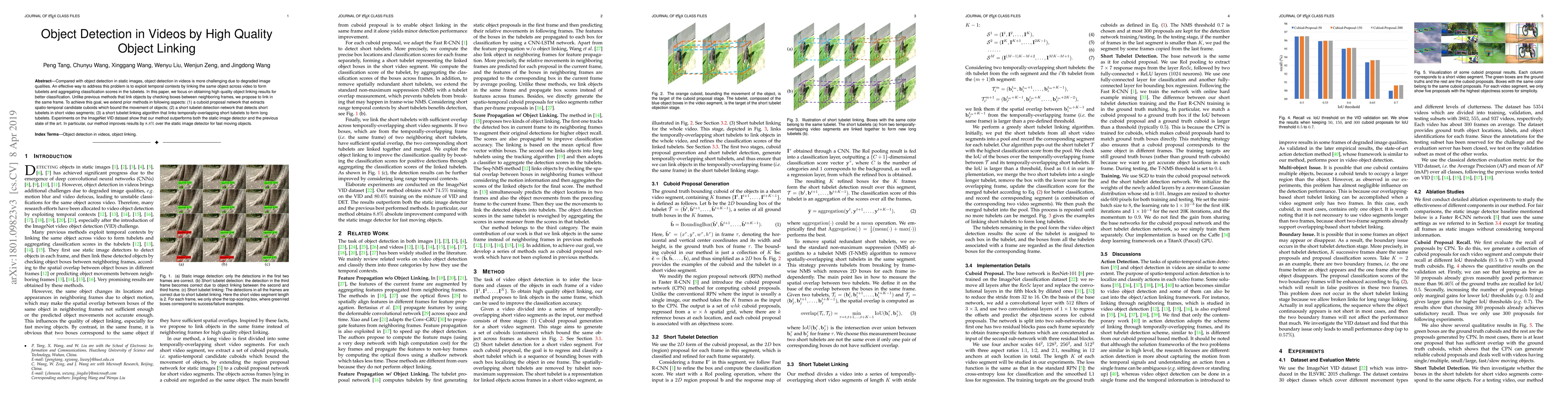This paper proposes a novel method for object detection in videos by linking objects within the same frame to form tubelets, enhancing temporal context. The method includes a cuboid proposal network, a short tubelet detection network, and a linking algorithm to create long tubelets, achieving superior performance on the ImageNet VID dataset, especially for fast-moving objects.