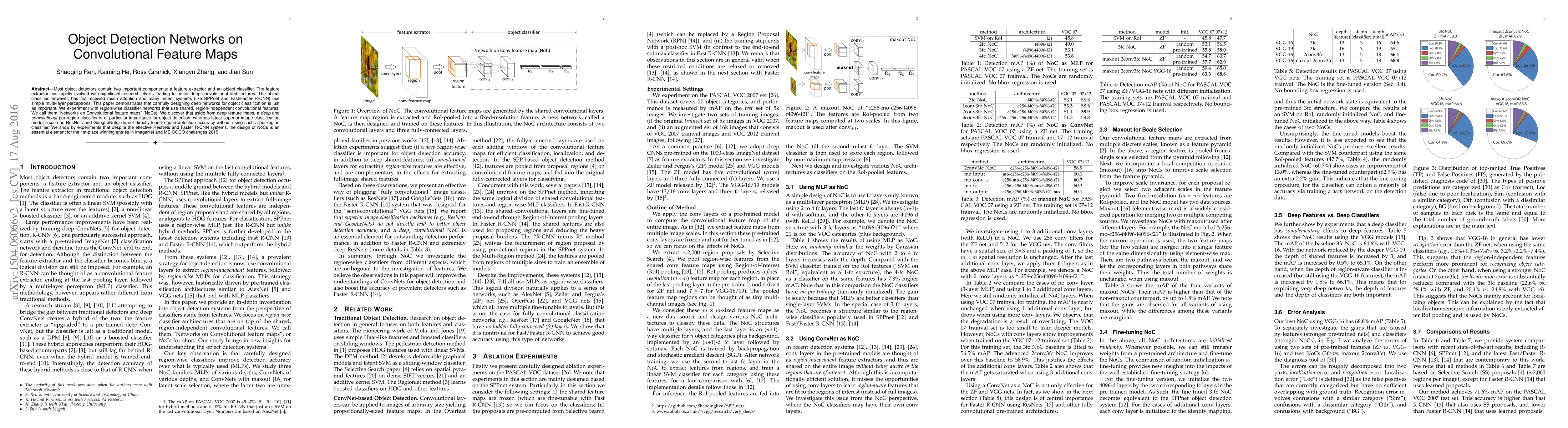 The paper proposes 'Networks on Convolutional Feature Maps' (NoCs) for object classification in object detection networks, emphasizing the importance of designing deep, convolutional per-region classifiers alongside deep feature maps. It experiments with various NoC architectures, including MLPs and ConvNets, and investigates the impact of fine-tuning and maxout for scale selection.