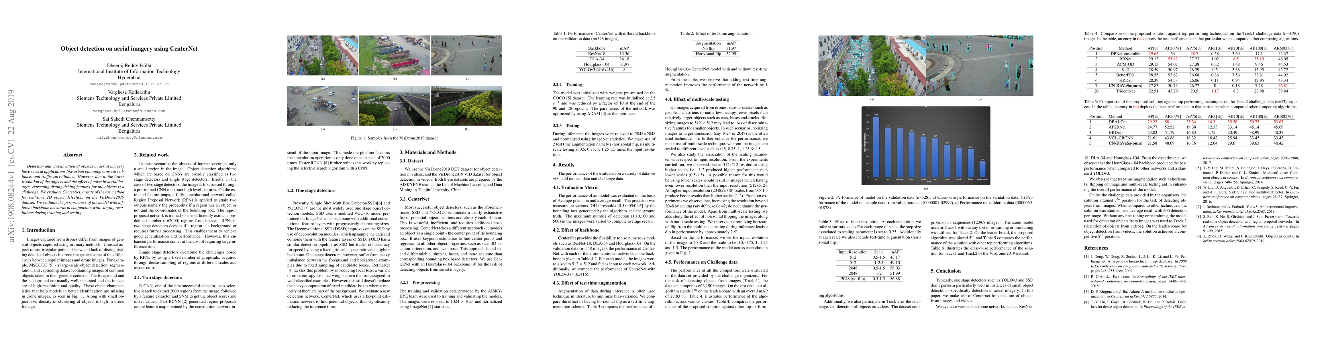 Detection and classification of objects in aerial imagery have several applications like urban planning, crop surveillance, and traffic surveillance. However, due to the lower resolution of the objects and the effect of noise in aerial images, extracting distinguishing features for the objects is a challenge. We evaluate CenterNet, a state of the art method for real-time 2D object detection, on the VisDrone2019 dataset. We evaluate the performance of the model with different backbone networks in conjunction with varying resolutions during training and testing.