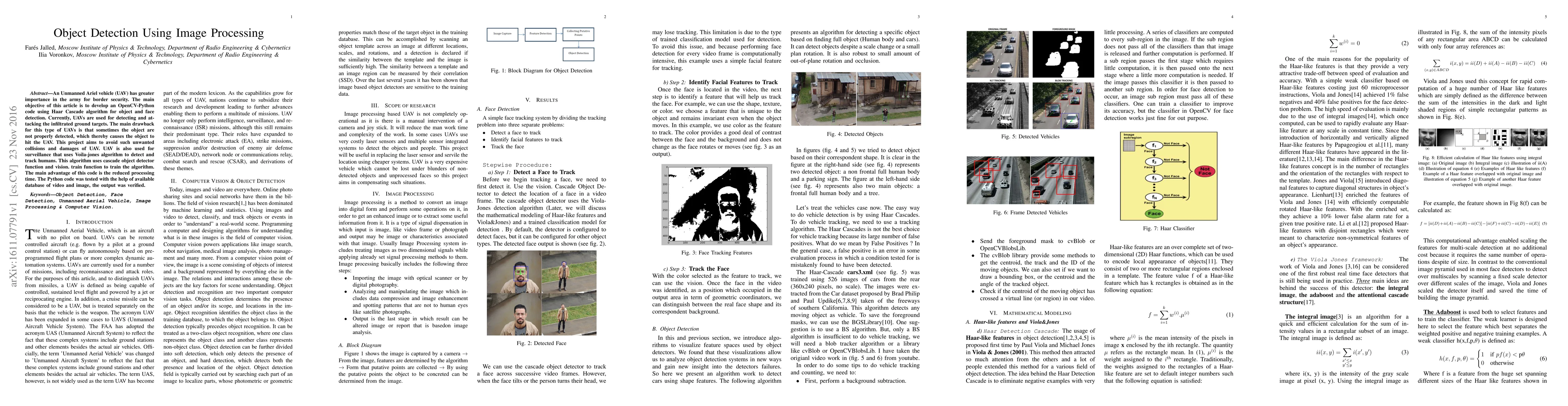 This paper develops an OpenCV-Python code using the Haar Cascade algorithm for object and face detection in UAVs to enhance border security and avoid collisions. The Voila-Jones algorithm, with its reduced processing time, is tested on a database of video and image data.