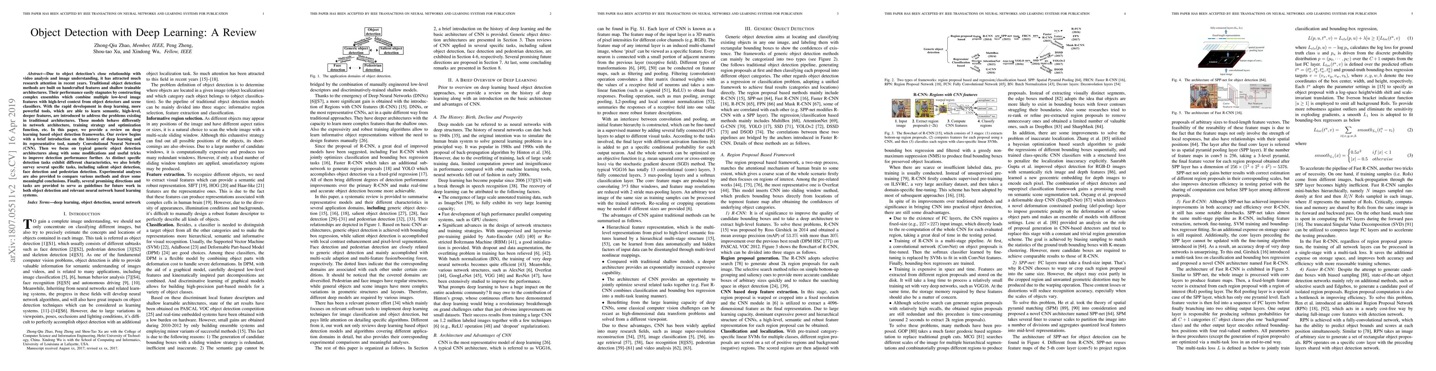 Due to object detection's close relationship with video analysis and image understanding, it has attracted much research attention in recent years. Traditional object detection methods are built on handcrafted features and shallow trainable architectures. Their performance easily stagnates by constructing complex ensembles which combine multiple low-level image features with high-level context from object detectors and scene classifiers. With the rapid development in deep learning, more powerful tools, which are able to learn semantic, high-level, deeper features, are introduced to address the problems existing in traditional architectures. These models behave differently in network architecture, training strategy and optimization function, etc. In this paper, we provide a review on deep learning based object detection frameworks. Our review begins with a brief introduction on the history of deep learning and its representative tool, namely Convolutional Neural Network (CNN). Then we focus on typical generic object detection architectures along with some modifications and useful tricks to improve detection performance further. As distinct specific detection tasks exhibit different characteristics, we also briefly survey several specific tasks, including salient object detection, face detection and pedestrian detection. Experimental analyses are also provided to compare various methods and draw some meaningful conclusions. Finally, several promising directions and tasks are provided to serve as guidelines for future work in both object detection and relevant neural network based learning systems.
