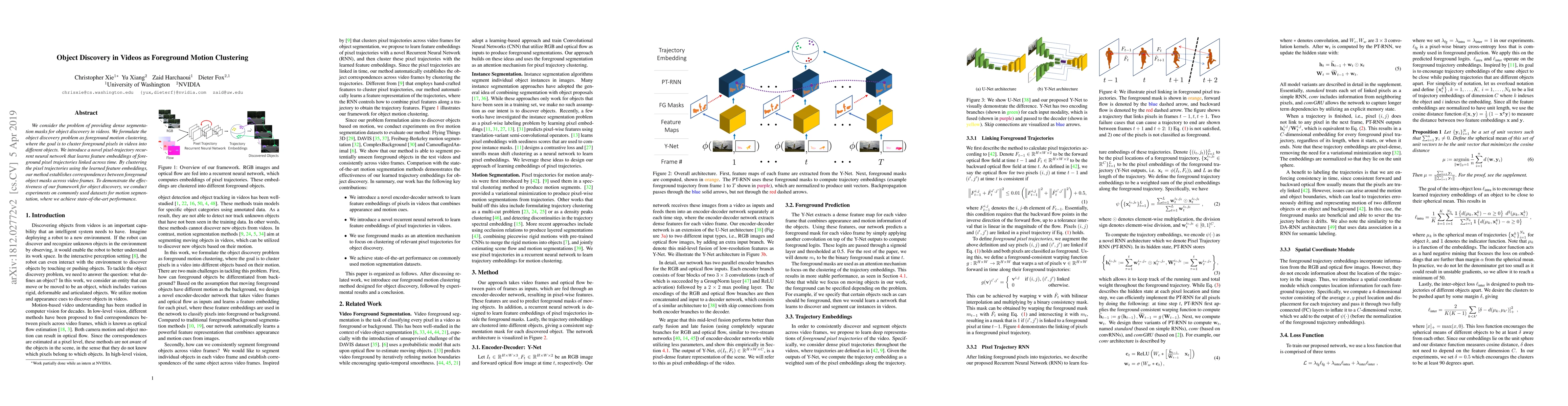 This paper proposes a novel method for object discovery in videos by clustering foreground motion using a pixel-trajectory recurrent neural network, achieving state-of-the-art performance on standard datasets for motion segmentation. The approach learns feature embeddings of pixel trajectories to establish correspondences between object masks across frames.