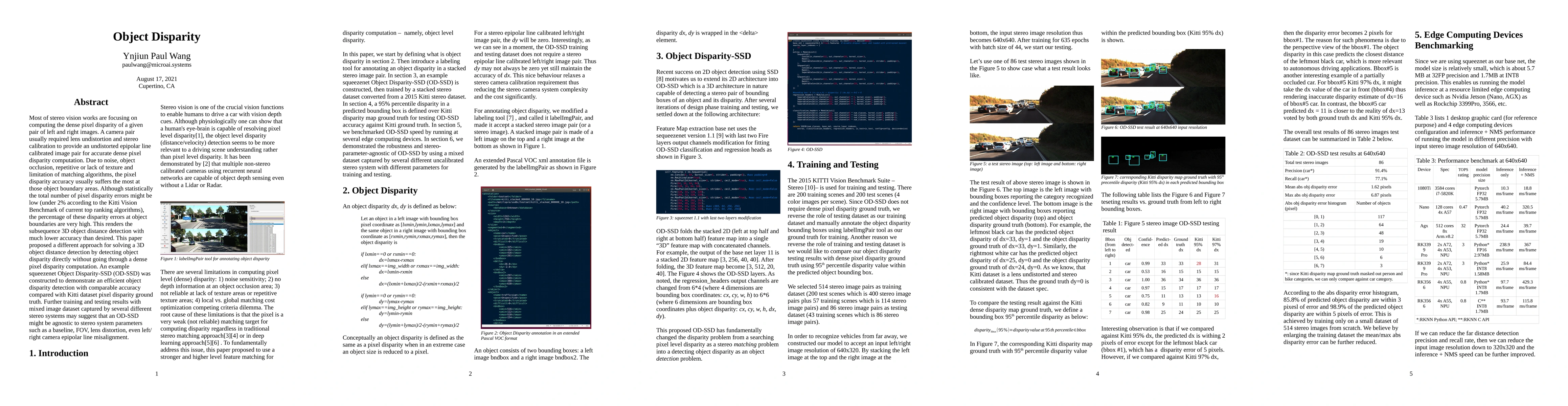 This paper proposes a novel approach for 3D object distance detection by directly detecting object disparity, bypassing dense pixel disparity computation. The OD-SSD model demonstrates comparable accuracy to pixel disparity ground truth, showing potential agnosticism to stereo system parameters.
