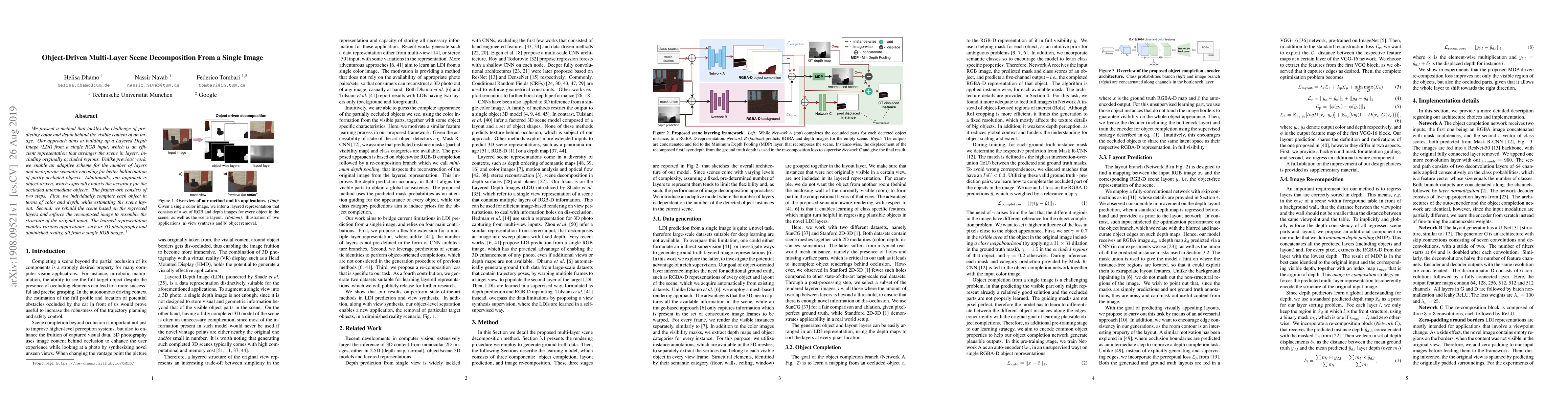This paper proposes an object-driven method for decomposing a single RGB image into a Layered Depth Image (LDI), predicting color and depth behind visible content. It adaptively determines the number of layers and uses semantic encoding to enhance the reconstruction of occluded regions, enabling applications like 3D photography and diminished reality.