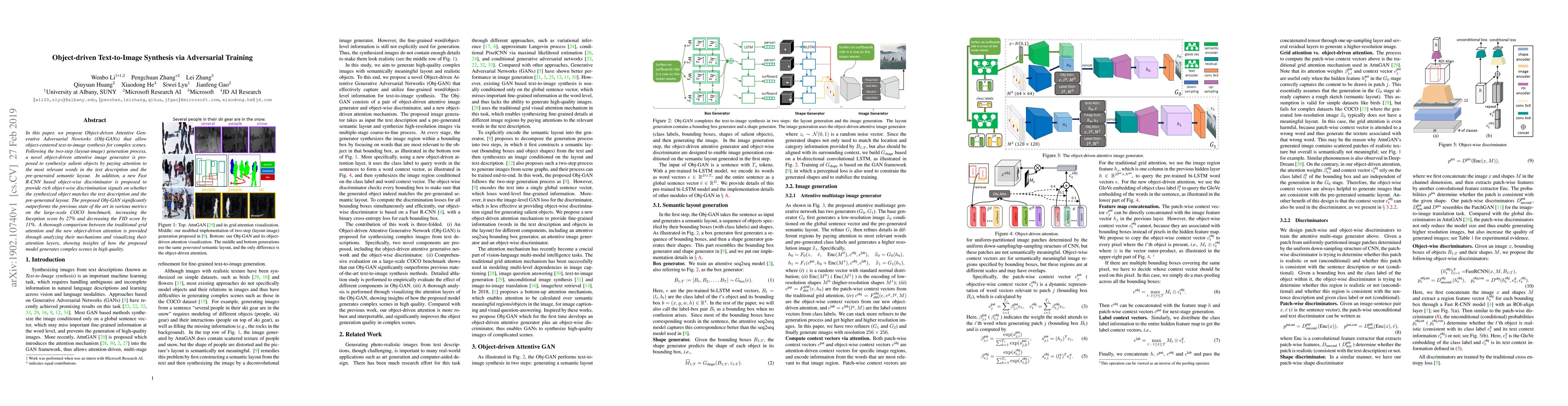 This paper introduces Object-driven Attentive Generative Adversarial Networks (Obj-GANs) for object-centered text-to-image synthesis, significantly outperforming previous methods on the COCO benchmark by improving the Inception score and reducing the FID score. The model employs an object-driven attentive image generator and an object-wise discriminator for enhanced object matching.