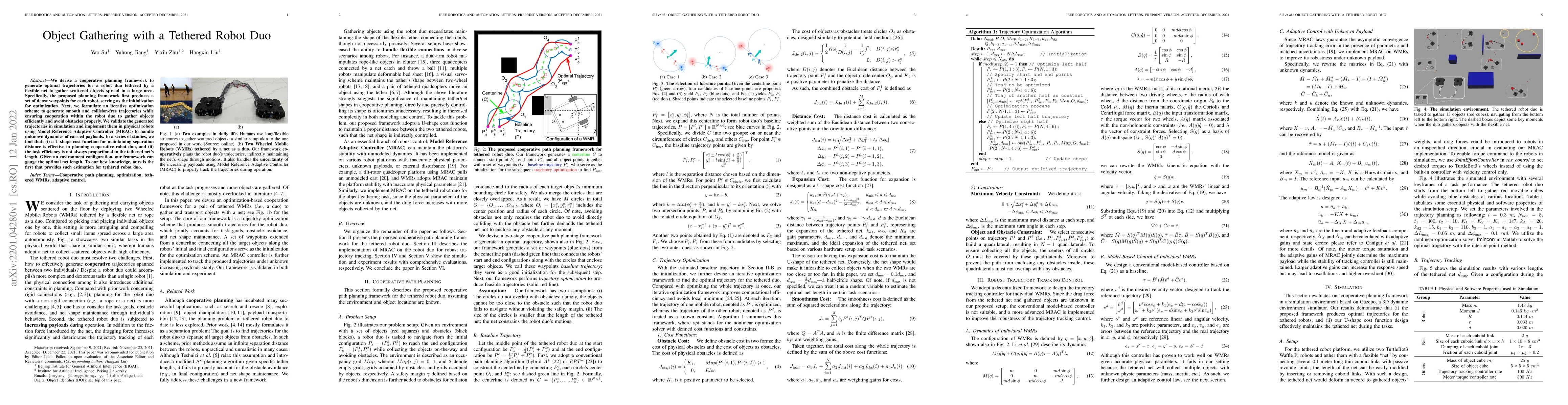We devise a cooperative planning framework to generate optimal trajectories for a tethered robot duo, who is tasked to gather scattered objects spread in a large area using a flexible net. Specifically, the proposed planning framework first produces a set of dense waypoints for each robot, serving as the initialization for optimization. Next, we formulate an iterative optimization scheme to generate smooth and collision-free trajectories while ensuring cooperation within the robot duo to efficiently gather objects and properly avoid obstacles. We validate the generated trajectories in simulation and implement them in physical robots using Model Reference Adaptive Controller (MRAC) to handle unknown dynamics of carried payloads. In a series of studies, we find that: (i) a U-shape cost function is effective in planning cooperative robot duo, and (ii) the task efficiency is not always proportional to the tethered net's length. Given an environment configuration, our framework can gauge the optimal net length. To our best knowledge, ours is the first that provides such estimation for tethered robot duo.