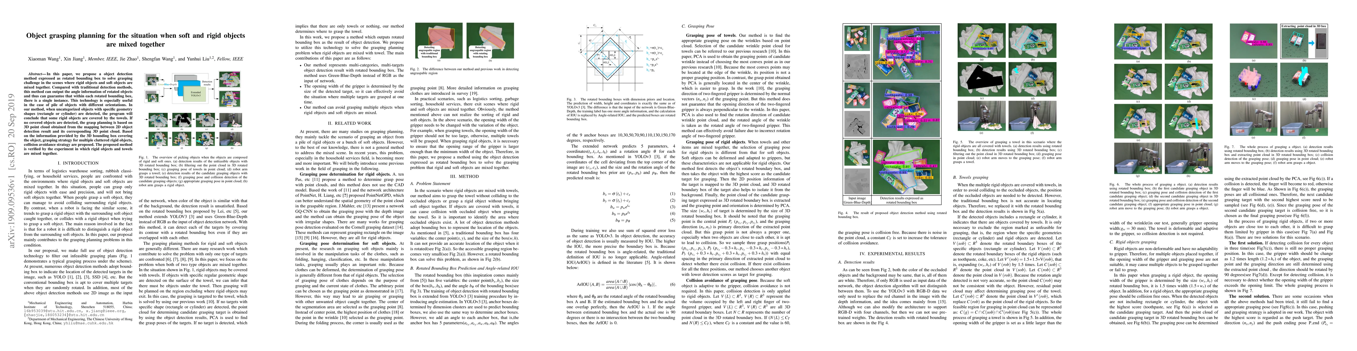 In this paper, we propose a object detection method expressed as rotated bounding box to solve grasping challenge in the scenes where rigid objects and soft objects are mixed together. Compared with traditional detection methods, this method can output the angle information of rotated objects and thus can guarantee that within each rotated bounding box, there is a single instance. This technology is especially useful in the case of pile of objects with different orientations. In our method, when uncategorized objects with specific geometry shapes (rectangle or cylinder) are detected, the program will conclude that some rigid objects are covered by the towels. If no covered objects are detected, the grasp planning is based on 3D point cloud obtained from the mapping between 2D object detection result and its corresponding 3D point cloud. Based on the information provided by the 3D bounding box covering the object, grasping strategy for multiple cluttered rigid objects, collision avoidance strategy are proposed. The proposed method is verified by the experiment in which rigid objects and towels are mixed together.